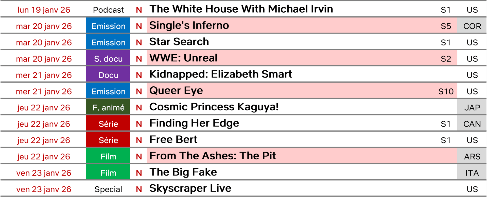 C’est une semaine assez étrange qui nous attend la semaine prochaine avec deux évènements en direct (le retour de l’émission de télé-crochet Star Search et l’escalade en direct d’un batiment à Taipei). Les deux séries US qui sortent ne semblent pas des énormes cartons en prévision et les deux films internationaux non plus. On notera aussi le lancement du premier podcast vidéo original de Netflix, non-disponible en France pour l’instant. Je vois bien le docu true crime Kidnapped: Elizabeth Smart être donc l’attraction de la semaine mais on verra ça la semaine prochaine !