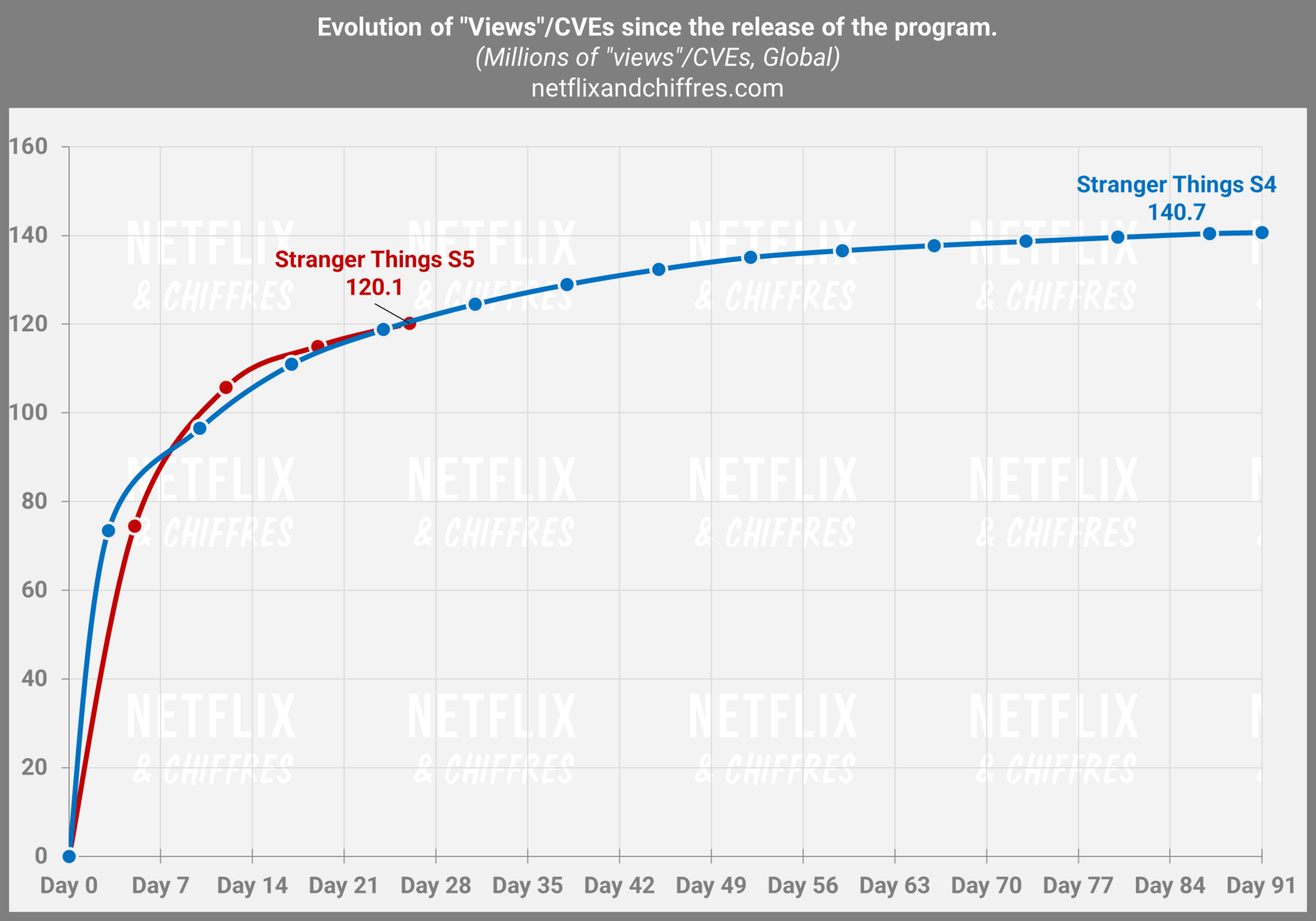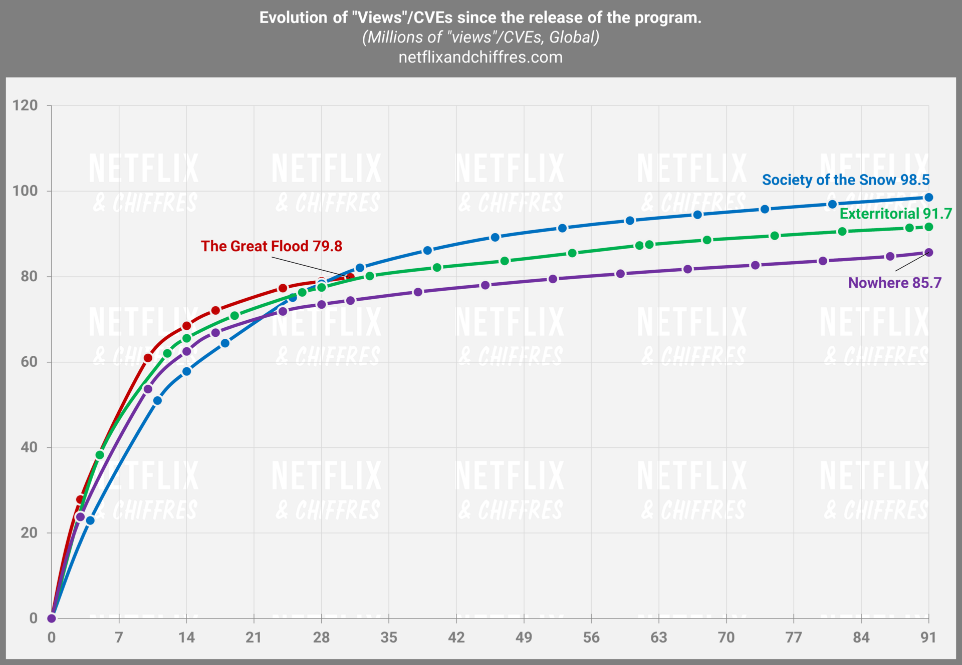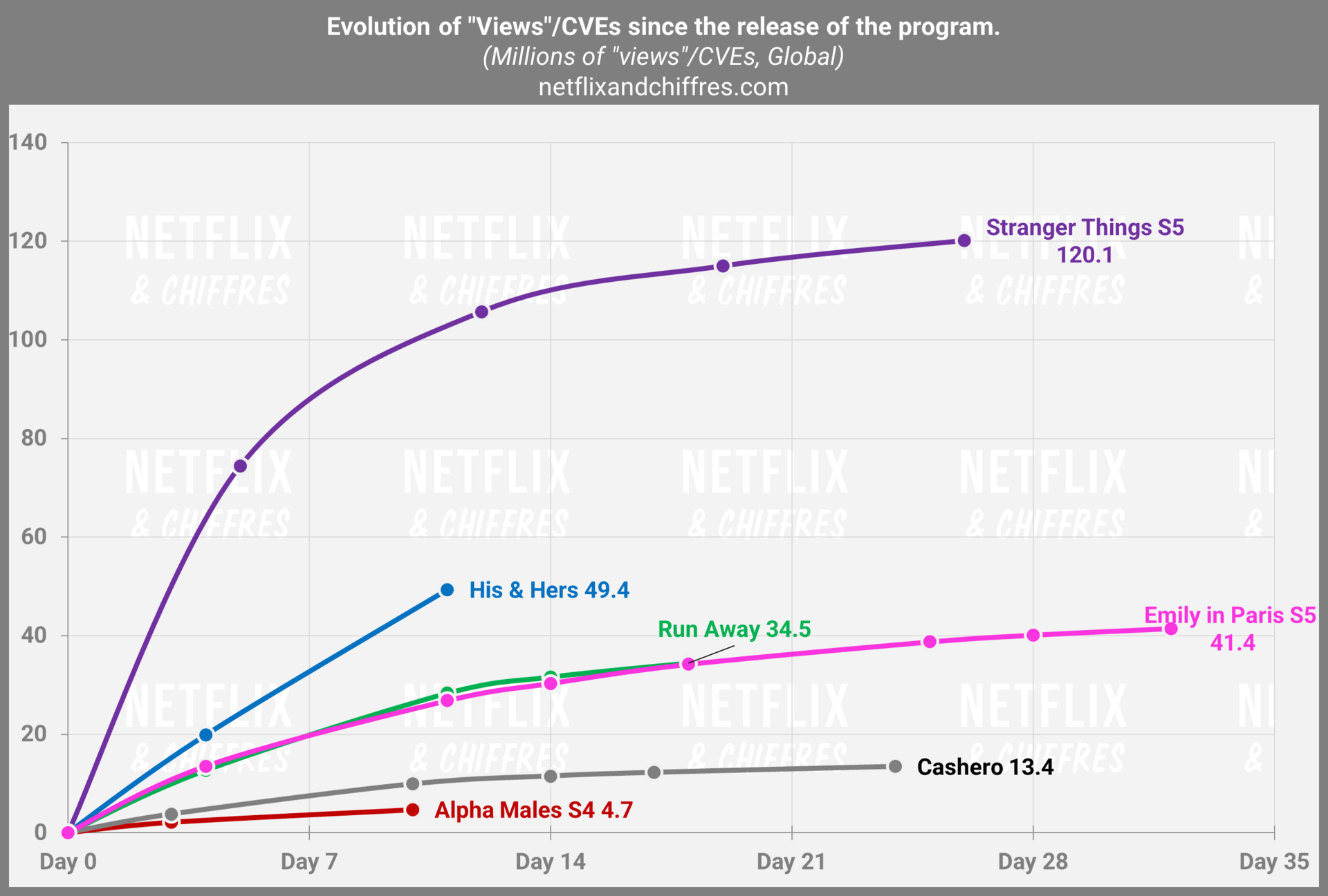 La mini-série His & Hers fait une excellente deuxième semaine et tutoie déjà la barre des 50M d’EVCs en à peine onze jours. Revenons aussi sur les performances de la saison 5 de Stranger Things et comme je le disais la semaine dernière, la saison finale de cette série phare devrait faire moins que la saison 4, avec une trajectoire bien moins ascendante qui se confirme cette semaine. 130-135M au bout de 91 jours reste mon hypothèse.