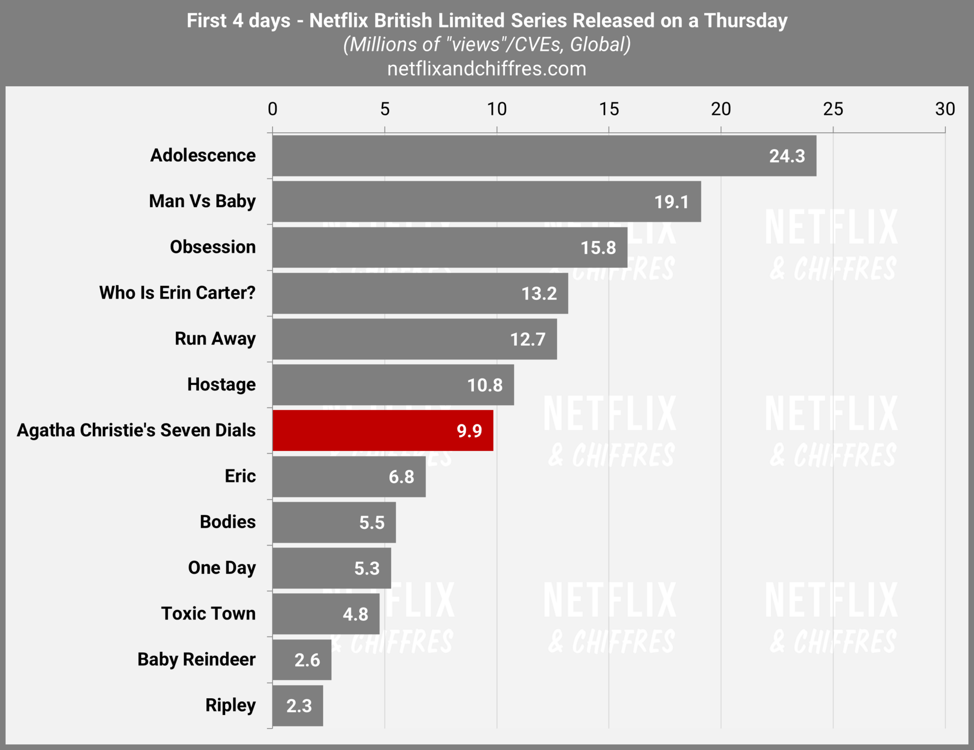 Agatha Christie ne semble pas attirer les foules sur Netflix puisque la mini-série très prestigieuse Seven Dials fait un lancement moyen, à hauteur de 9,9M d’EVCs sur ses 4 premiers jours et ce, malgré sa faible durée (à peine trois petits épisodes). J’ai vu le premier, j’ai failli m’endormir trois fois devant mais c’est sans doute sans rapport.