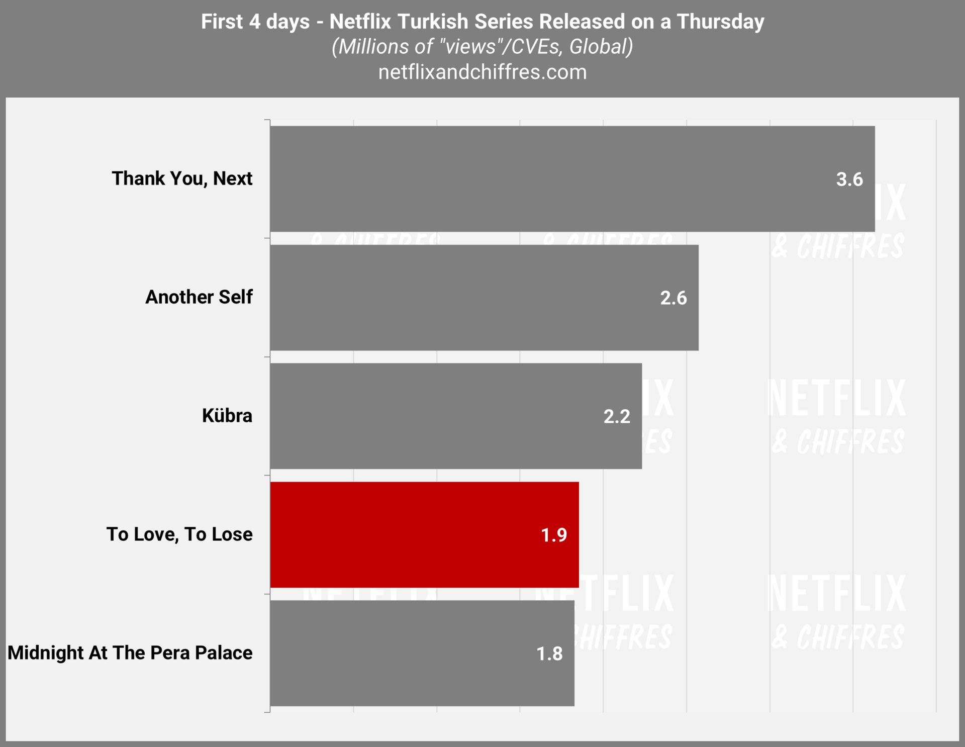 C’est un peu moins bon pour le lancement de la série turque romantique To Love, To Lose qui fait un lancement assez faible, avec 1,9M d’EVCs sur ses 4 premiers jours, dans le bas du classement des lancements de séries turques un jeudi.