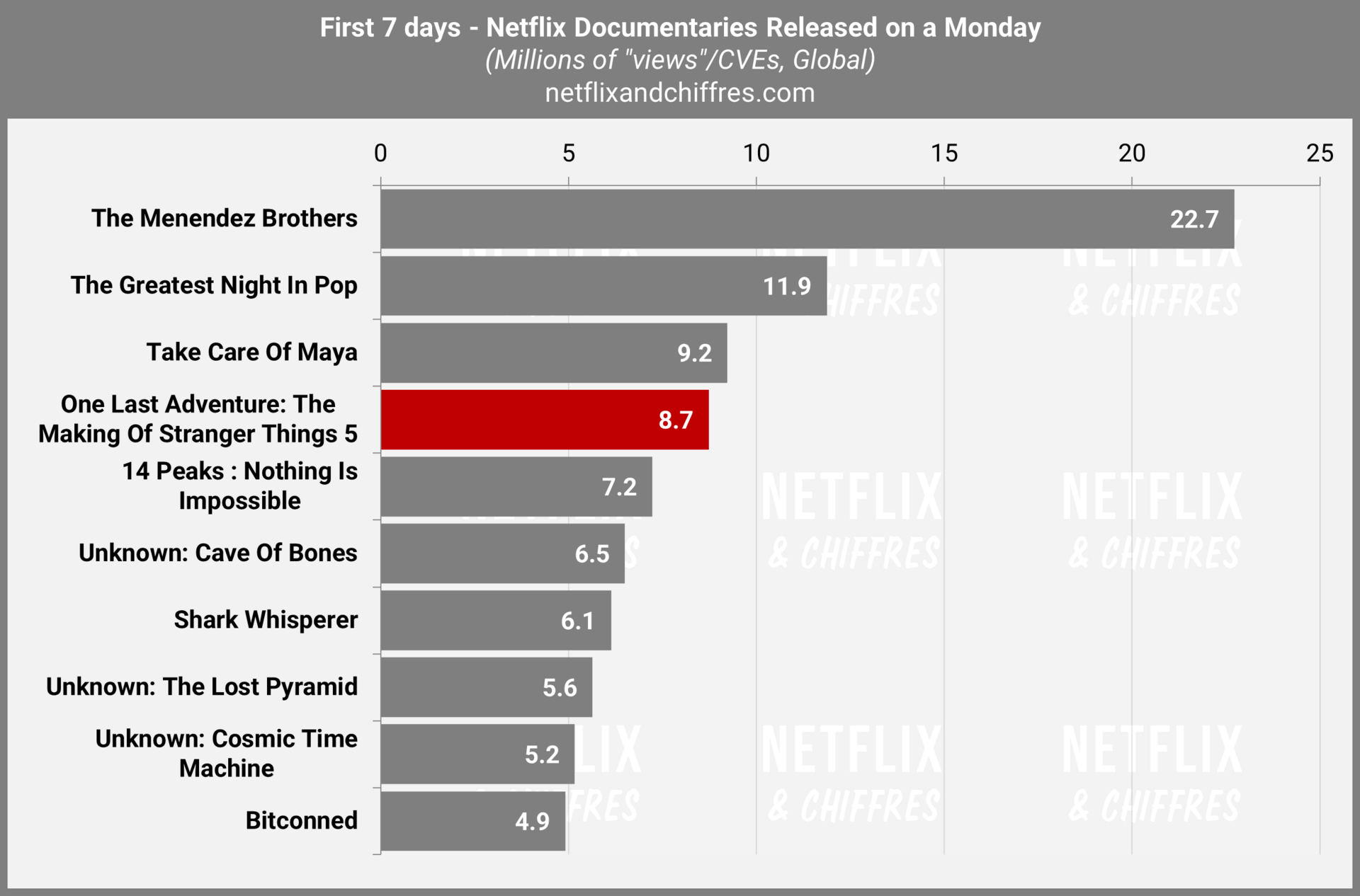 Le making-of de la saison finale de Stranger Things fait un lancement correct pour un docu sorti un lundi et on peut estimer qu’un peu moins de 9% du public de cette saison finale l’ont regardé sur sa première semaine. Mais nous n’avons pas d’autres comparaisons, notamment avec d’autres making-ofs qui ne pénètrent jamais le top 10 à leur sortie.