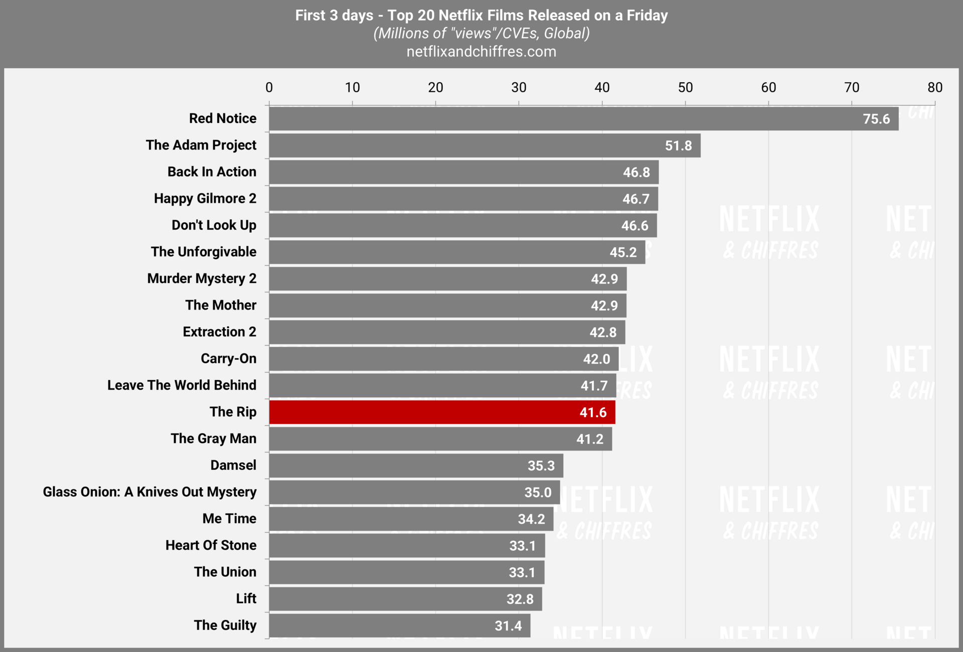 On va voir comment il se comporte dans les prochaines semaines (calmes) sur Netflix mais si les bonus de performance négociés par les deux acteurs au nom de l’équipe de tournage sont basés sur l’entrée ou non dans le Top 10 all-time, c’est un démarrage un peu insuffisant pour le moment.
