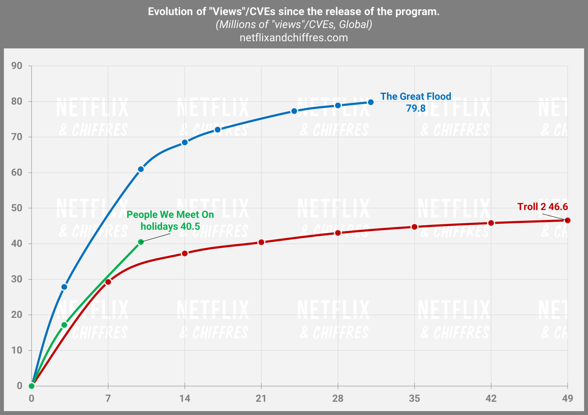 Mesure utilisée : Millions d’EVC, soit en Équivalents de Visionnages Complets. Je divise les heures vues (lundi à dimanche dernier dans 192 pays) des Tops 10 Netflix, par la durée des titres pour comparer des programmes de taille différente sortis à des dates différentes. Ce n’est pas une audience en téléspectateurs mais un indicateur arbitraire utilisé aussi depuis juin 2023 par Netflix sous l’appellation “views”. Pour en savoir plus sur ma méthode, lisez cet article.