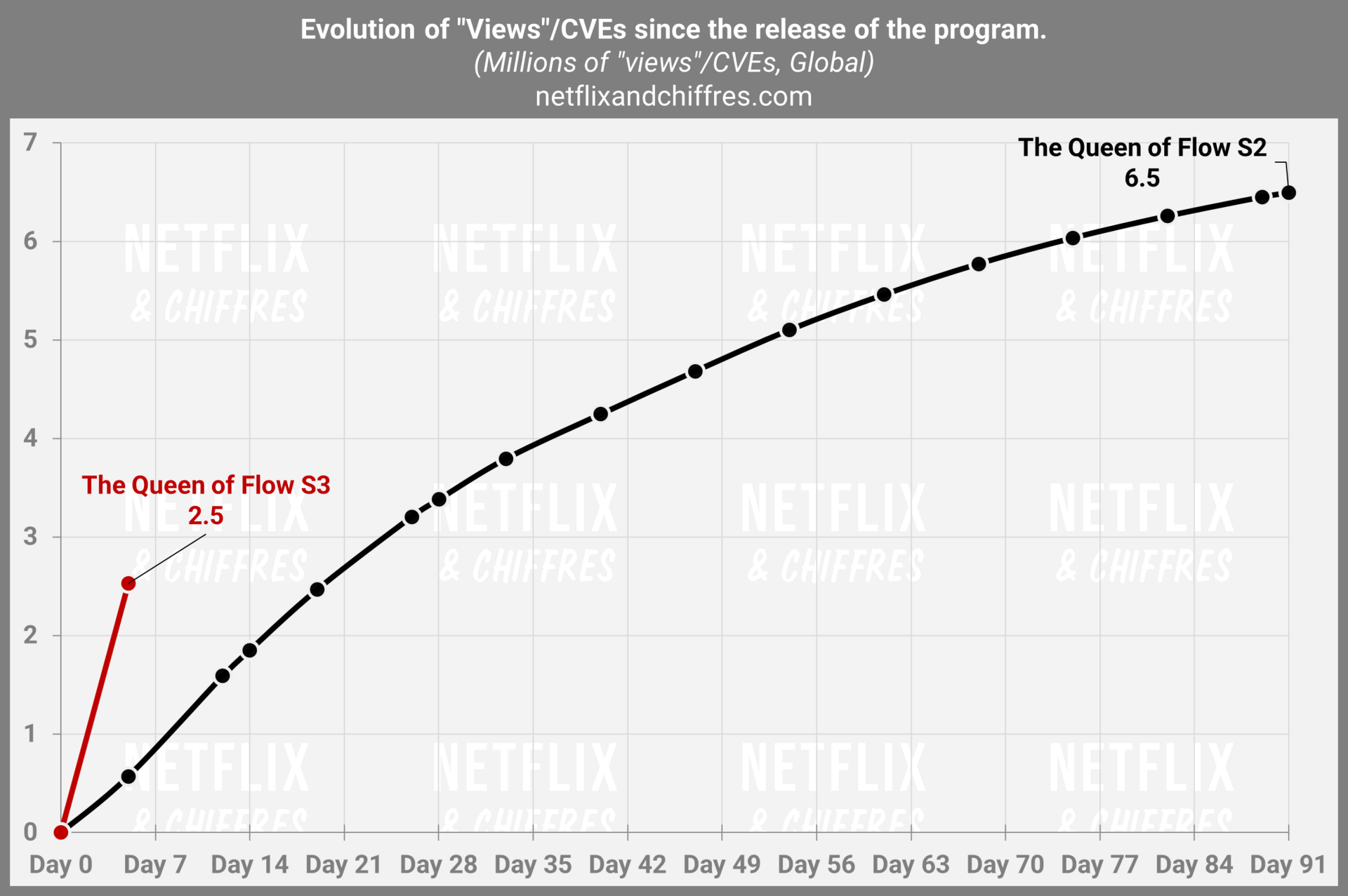 La durée est aussi importante pour la saison 3 de la série colombienne The Queen Of Flow qui revient 5 ans après sa saison 2. A l’époque et grâce au Top 10 qui s’établissait en heures vues, cette saison 2 était restée longtemps dans le Top 10 avec sa durée énorme de plus de 4000 minutes. La saison 3 est beaucoup plus courte (que 900 minutes mais tout de même) et elle fait donc de facto un meilleur lancement avec 2,5M d’EVCs sur ses premiers jours. On verra si sur la longueur elle arrivera à rester devant la saison 2.
