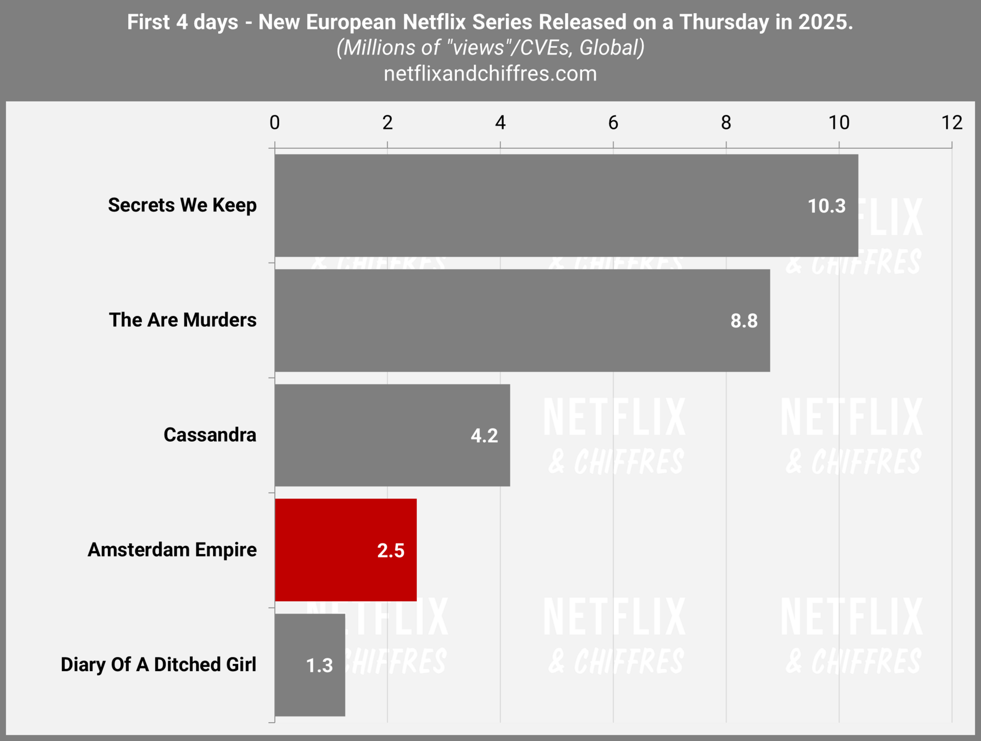 Rejoignez les centaines de pros du secteur audiovisuel, journalistes et amateurs déjà abonnés à Netflix & Chiffres ! Abonnez-vous et recevez dans votre boite mail chaque mercredi l’aperçu de toutes les audiences sur Netflix dans le monde et chaque samedi l’aperçu des audiences en streaming aux Etats-Unis sur tous les services.