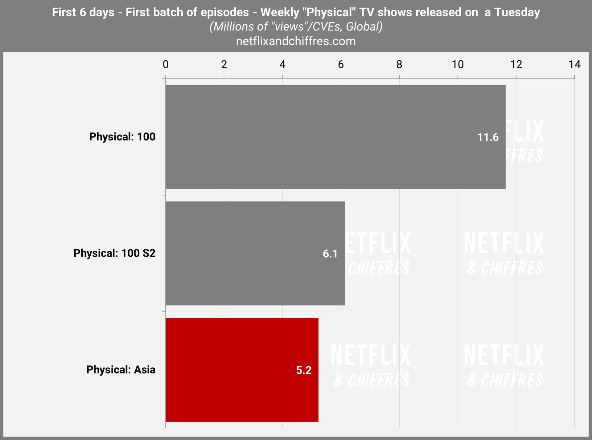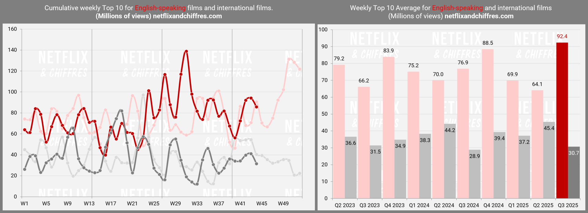 Mesure utilisée : Millions d’EVC, soit en Équivalents de Visionnages Complets. Je divise les heures vues (lundi à dimanche dernier dans 192 pays) des Tops 10 Netflix, par la durée des titres pour comparer des programmes de taille différente sortis à des dates différentes. Ce n’est pas une audience en téléspectateurs mais un indicateur arbitraire utilisé aussi depuis juin 2023 par Netflix sous l’appellation “views”. Pour en savoir plus sur ma méthode, lisez cet article.