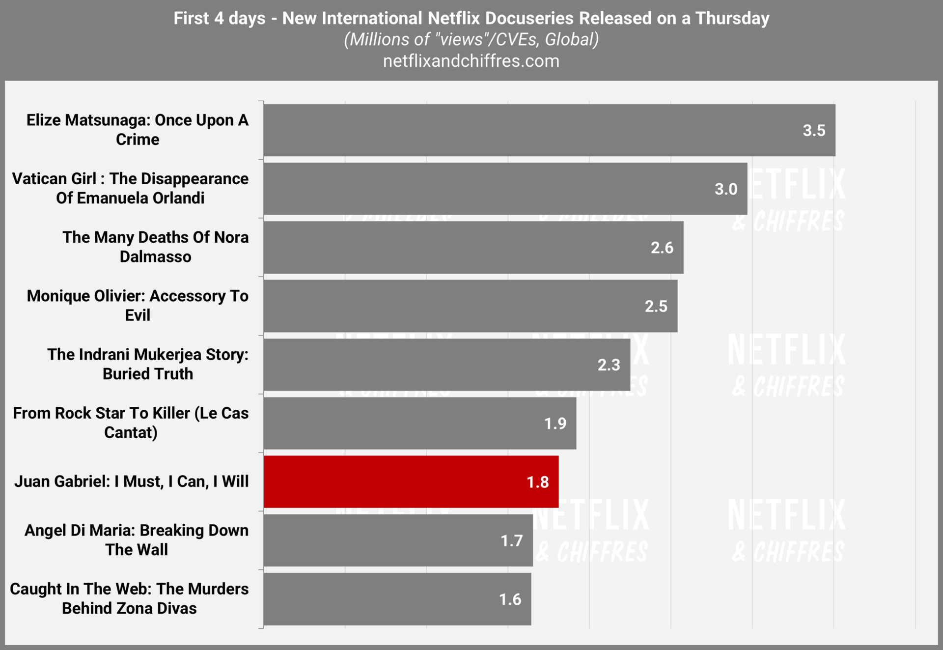 Terminons enfin avec la série docu consacrée à Juan Gabriel, un chanteur et acteur mexicain qui fait un lancement médiocre avec 1,8M d’EVCs sur ses 4 premiers jours. Je misais sur un no-show dans le Top 10 donc cela reste une surprise.