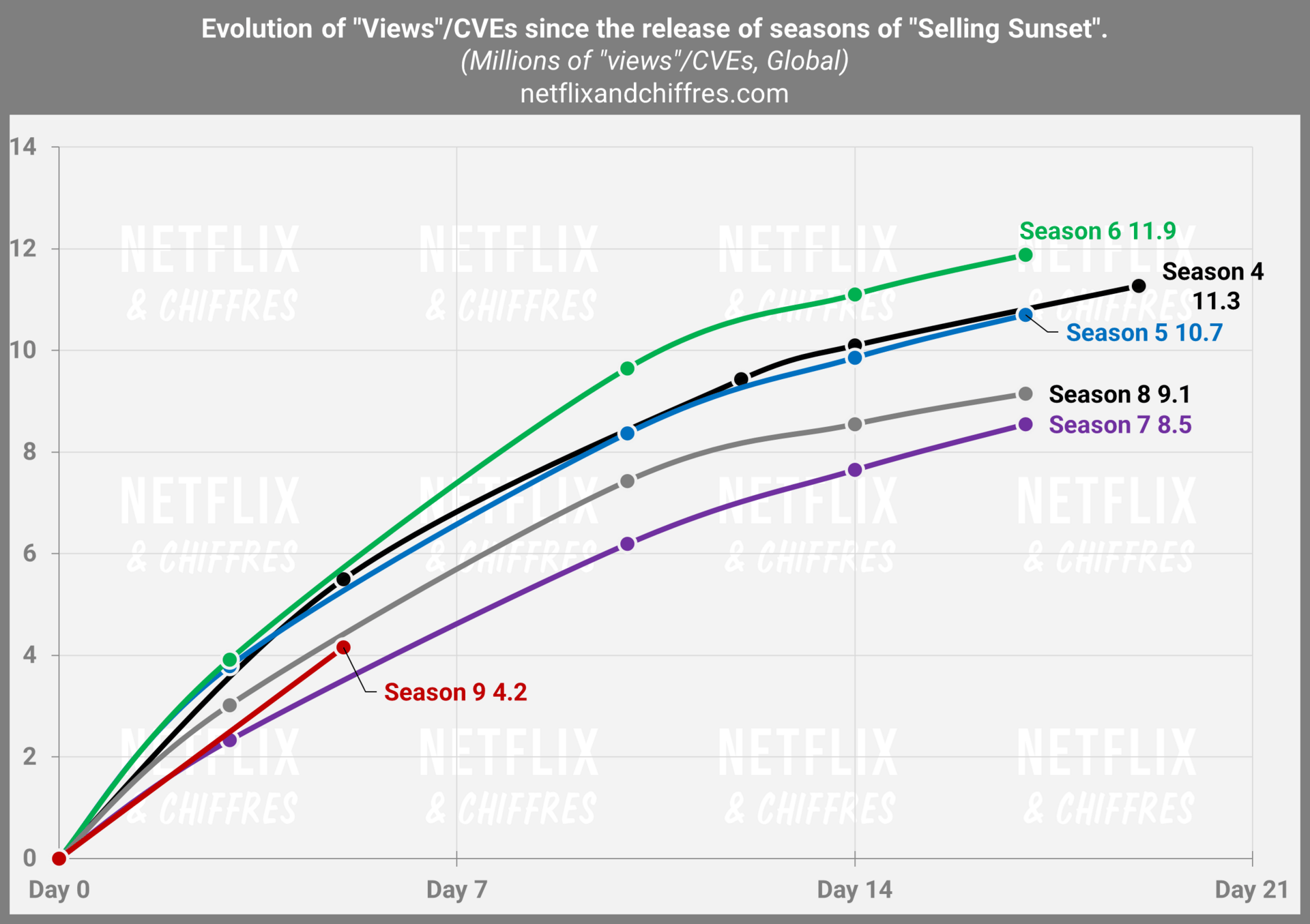 Je penche par contre pour un renouvellement pour Selling Sunset dont la saison 9 ne montre aucun signe de perte de vitesse par rapport aux saisons précédentes avec 4,2M d’EVCs sur ses 5 premiers jours. Elle devrait donc faire comme les deux saisons précédentes et obtenir un renouvellement.