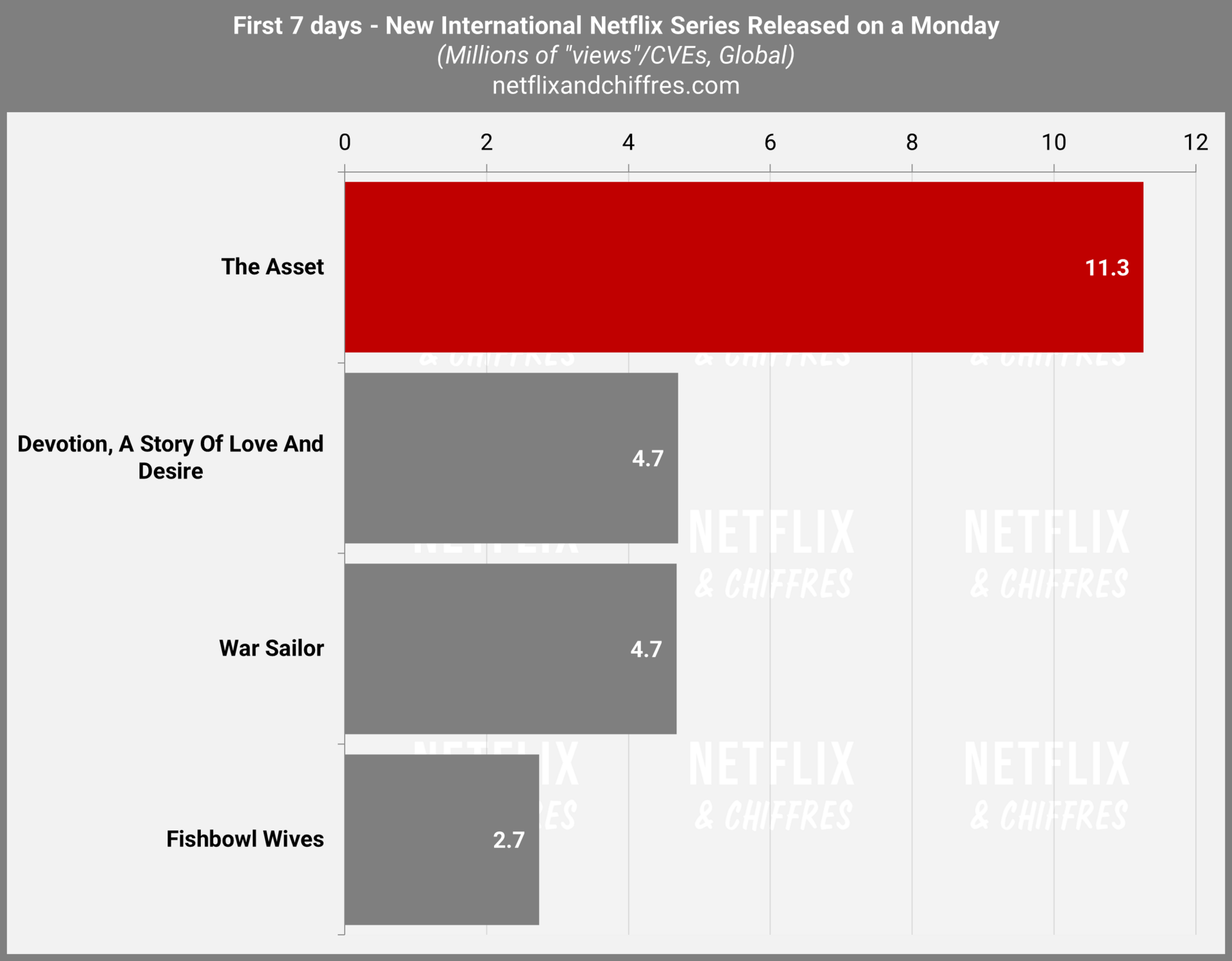 La barre était basse mais cela n’enlève rien à la performance de la série danoise The Asset qui réalise le meilleur lancement d’une série internationale sortie un lundi, en pulvérisant le score de la série italienne Devotion: A Story of Love And Desire avec 11,3M d’EVCs sur ses 7 premiers jours.