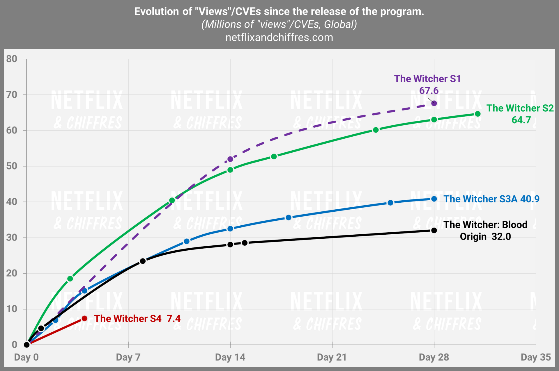 Le miracle n’a pas eu lieu. Changer Henry Cavill par Liam Hemsworth n’aura pas été le coup de jus nécessaire pour réanimer The Witcher dont la 4ème saison fait un lancement faible (en comparaison des saisons précédentes) avec seulement 7,3M d’EVCs sur ses 4 premiers jours. C’est un lancement inférieur à toutes les autres itérations de The Witcher lancées sur Netflix :