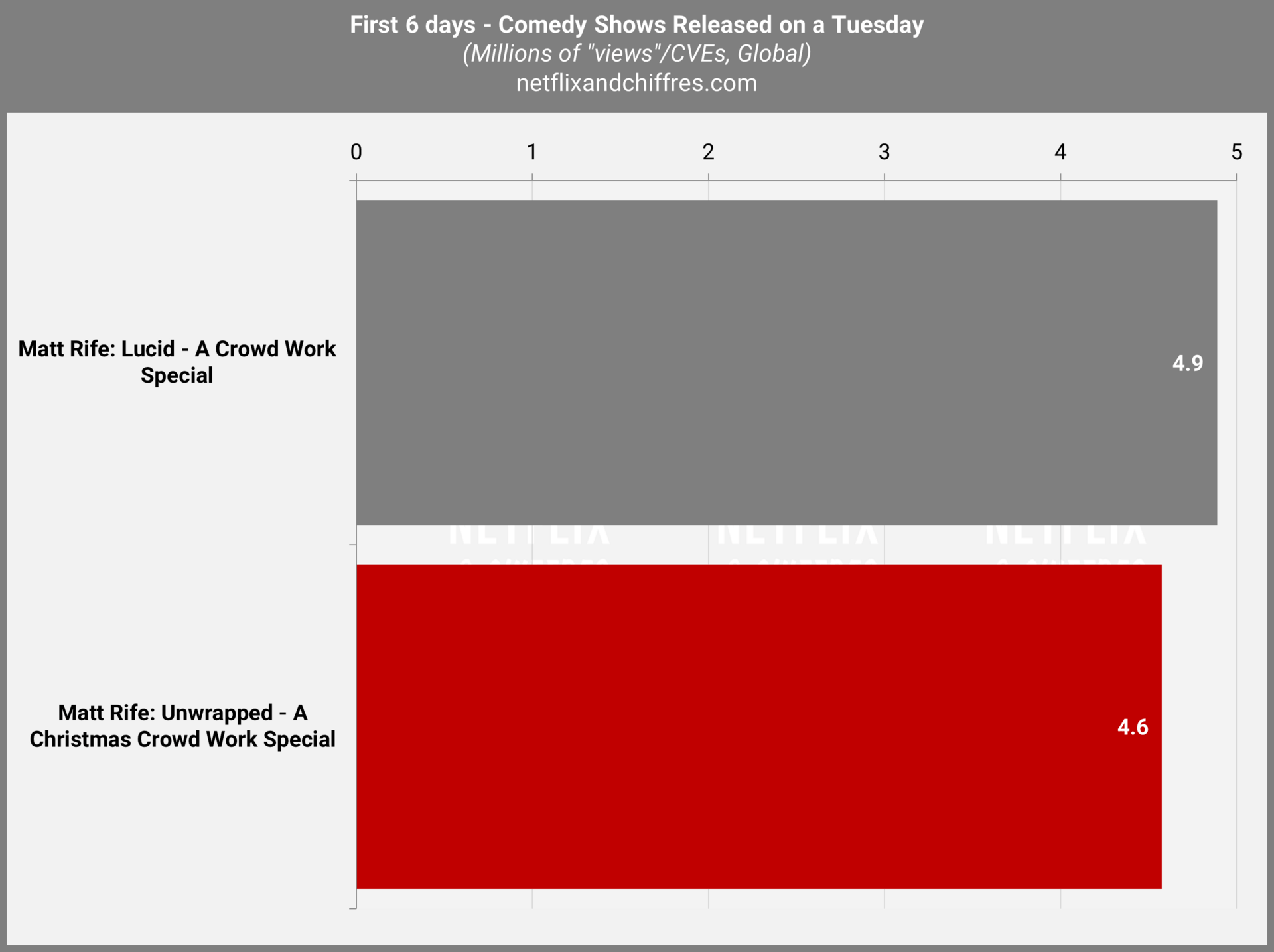 Côté spectacles, Matt Rife revenait pour un nouveau one-man show mettant en scène son public et ses fans sont aux rendez-vous puisque le nouveau spectacle a totalisé 4,6M d’EVCs sur ses 6 premiers jours, soit une très faible baisse par rapport au premier spectacle (4,9M sur le même intervalle).