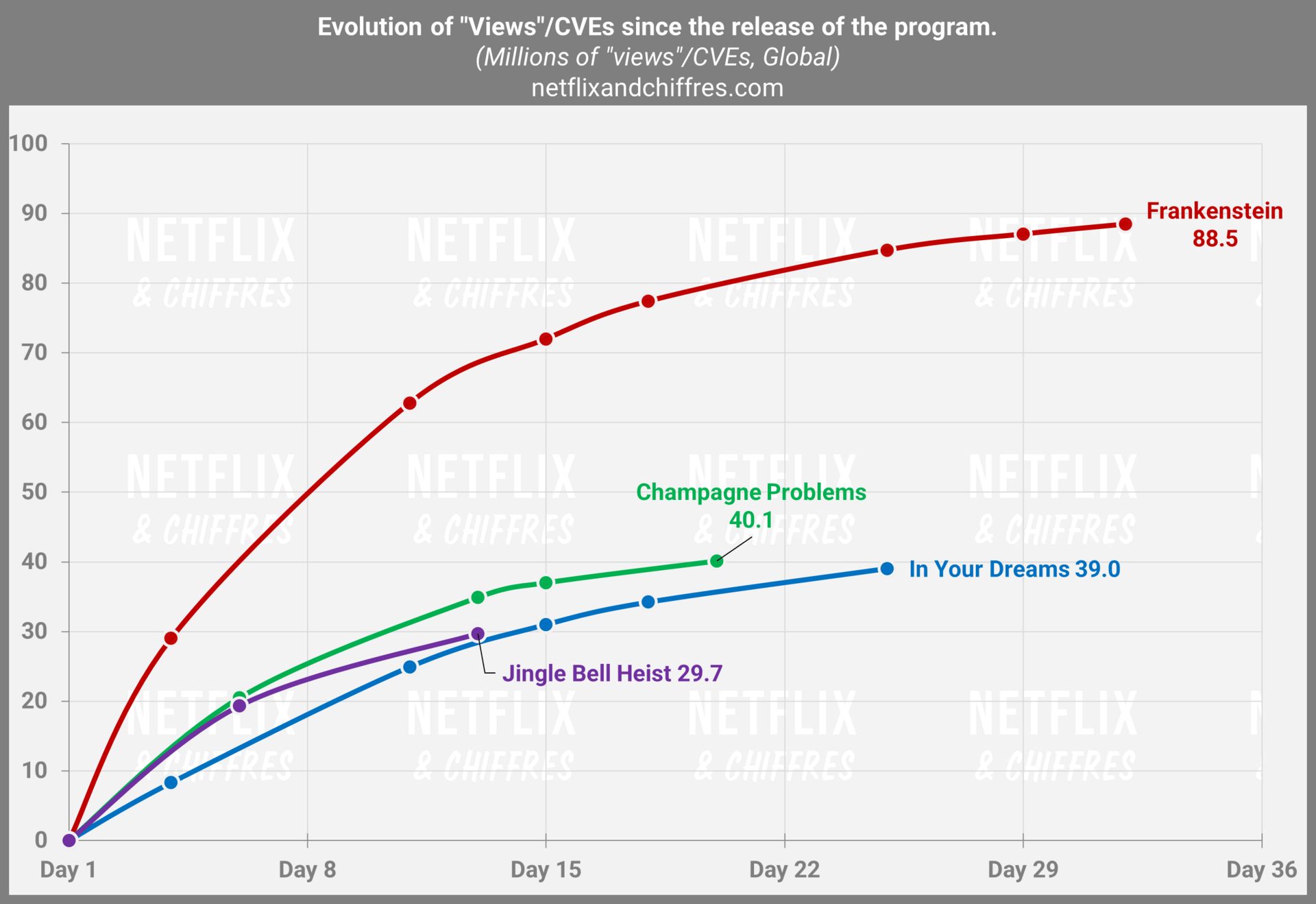 Frankenstein continue sa belle progression depuis sa sortie et en est à sa 5ème semaine dans le Top 10. Chez les films de Noël, Champagne Problems résiste mieux que Jingle Bell Heist.