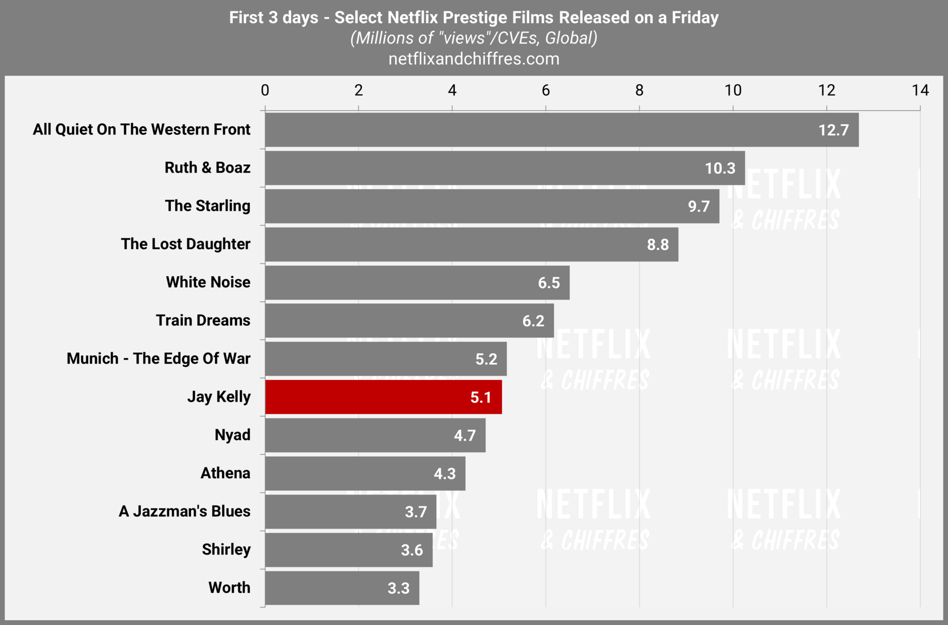 Le nouveau film de Noah Baumbach est l’un des paris de l’année de Netflix pour la saison des récompenses et comme tous les films qui s’intéressent à Hollywood et aux acteurs, Jay Kelly avec George Clooney ne rameute pas les foules avec seulement 5,1M d’EVCs sur ses 3 premiers jours, un lancement inférieur au précédent Baumbach White Noise (6.5M) et au magnifique Train Dreams sorti il y a deux semaines et qui n’avait pas le même casting.