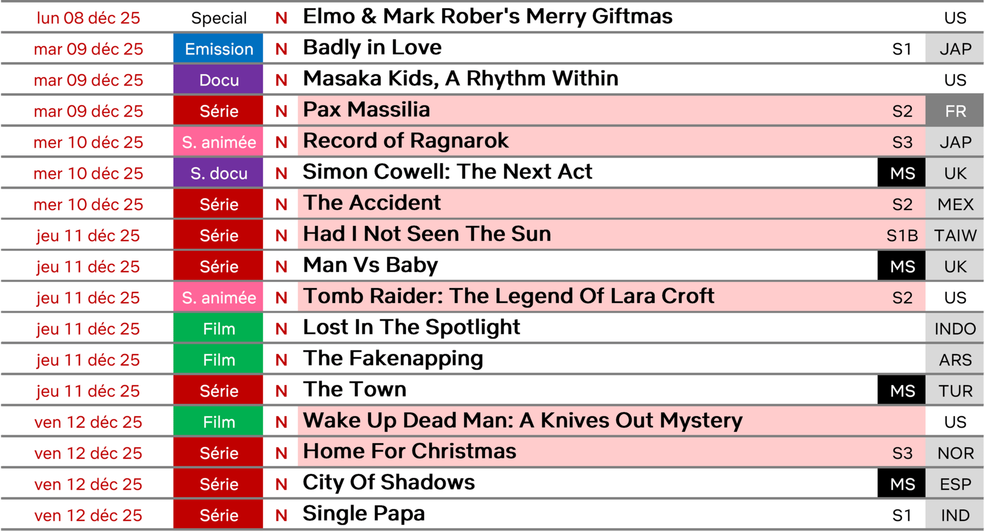 La semaine prochaine, on aura à nouveau un programme bien chargé avec la sortie de Wake Up Dead Man: A Knives Out Mystery mais aussi celle de Man vs Baby avec Rowan Atkinson, la saison 2 de Pax Massilia (dont la saison 3 est en tournage en janvier selon des annonces de casting) et la saison 2 finale de la série animée Tomb Raider (qui ne figurera pas dans le Top 10, j’annonce tout de suite).