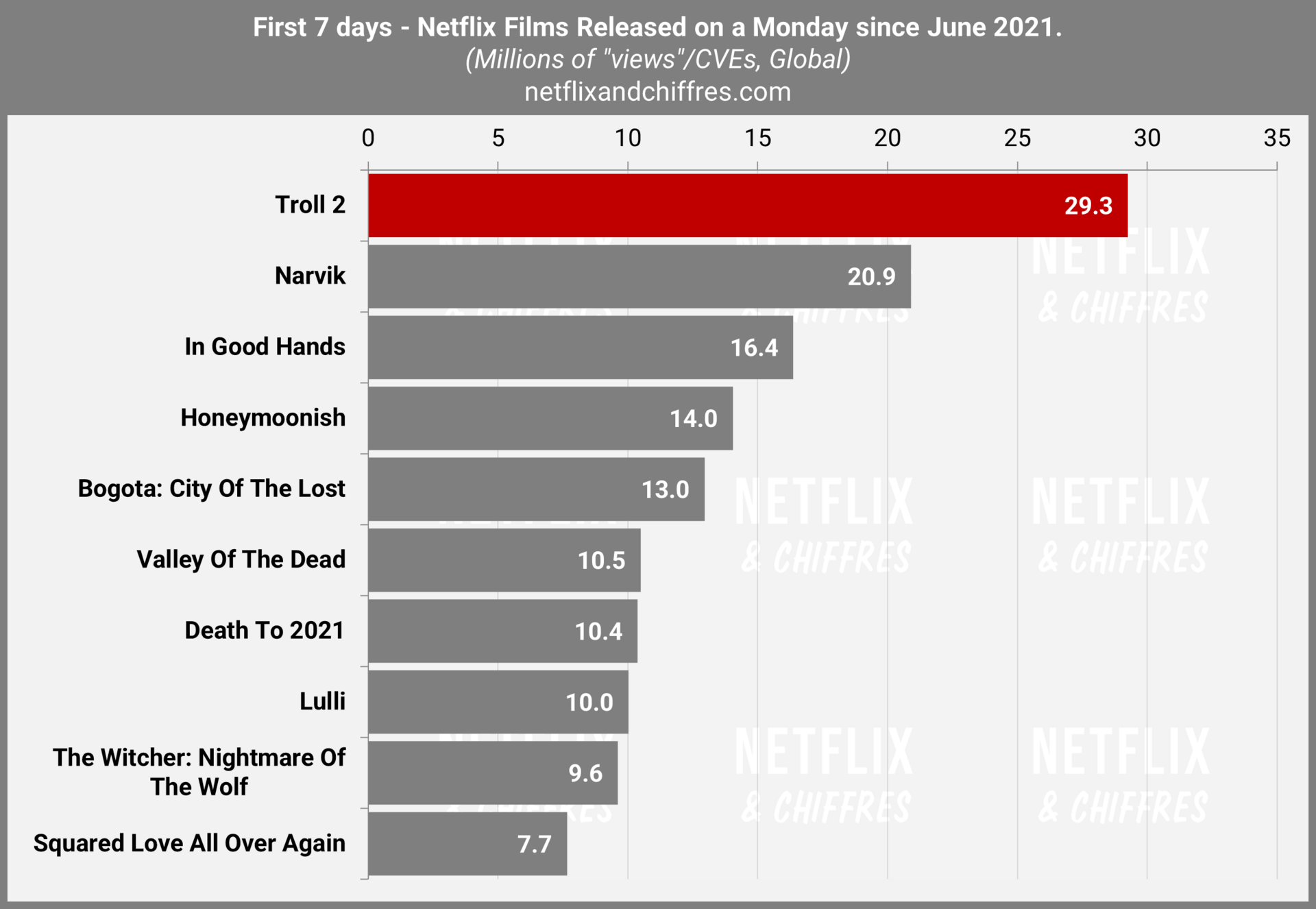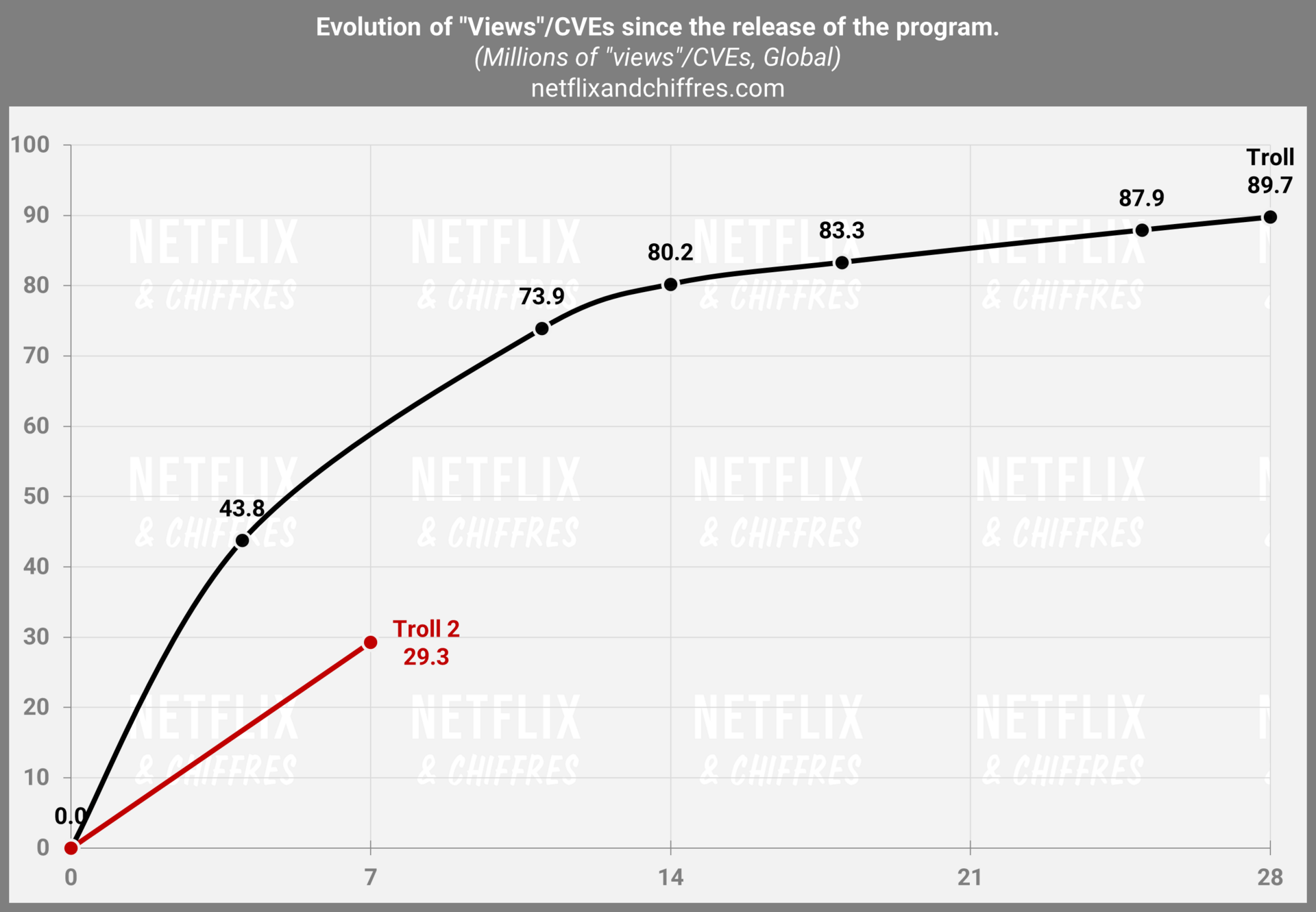 C’était l’attraction de la semaine : la sortie de la suite du méga-carton Troll et pour cela, Netflix avait décidé de sortir le film un lundi pour une raison inconnue. Si je devais parier, ce serait pour engranger le plus de vues sur la semaine pour afficher un chiffre record pour sa première semaine. Le but est-il atteint ? Pas vraiment, non. Certes, c’est un record pour un film sorti un lundi, avec 29.3M d’EVCs sur ses 7 premiers jours.