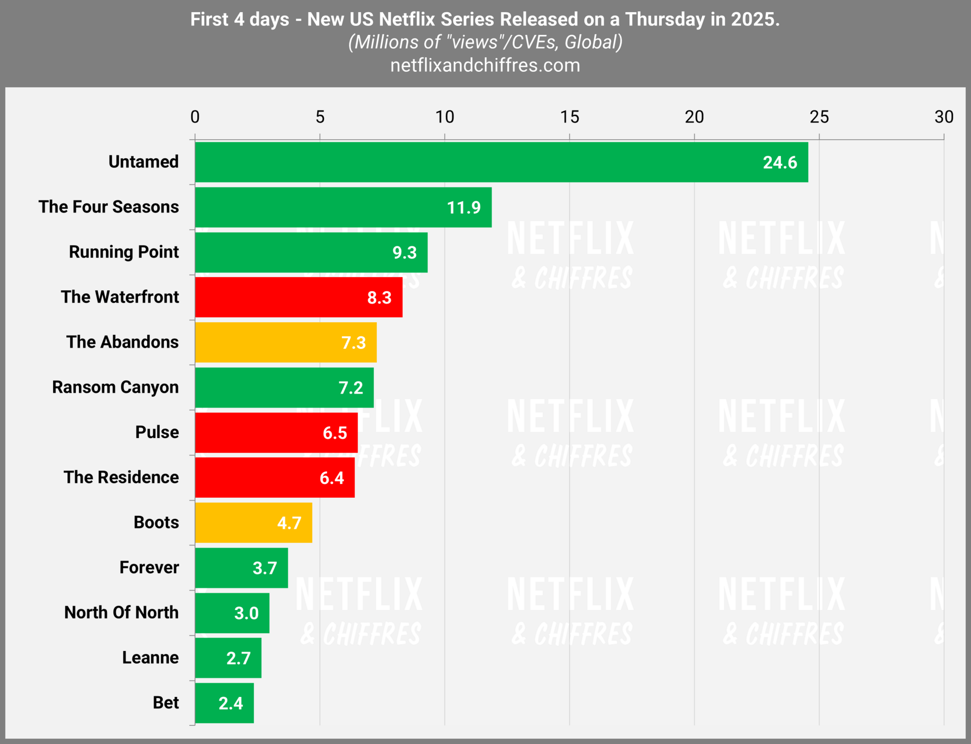 The Abandons est la nouvelle série de Kurt Sutter et son lancement est plutôt bon, dans l’ombre de la sortie de Stranger Things avec peu de promotion (j’ai l’impression). Avec 7,3M d’EVCs sur ses 4 premiers jours, c’est le 5ème meilleur lancement d’une série Netflix US (hors mini-série) mais cela ne la sauve pas forcément d’une annulation puisque la série numéro 4 a été annulée.