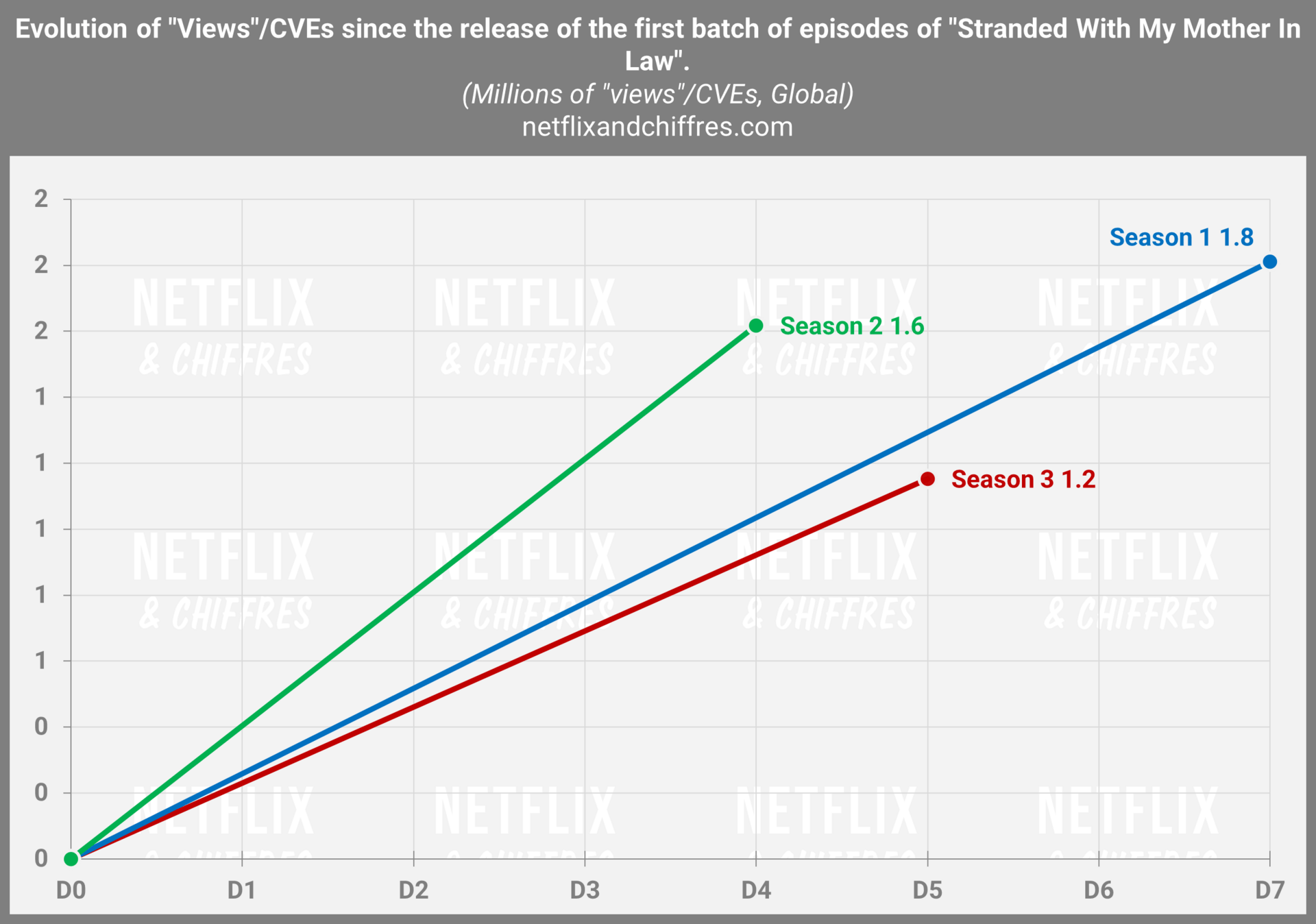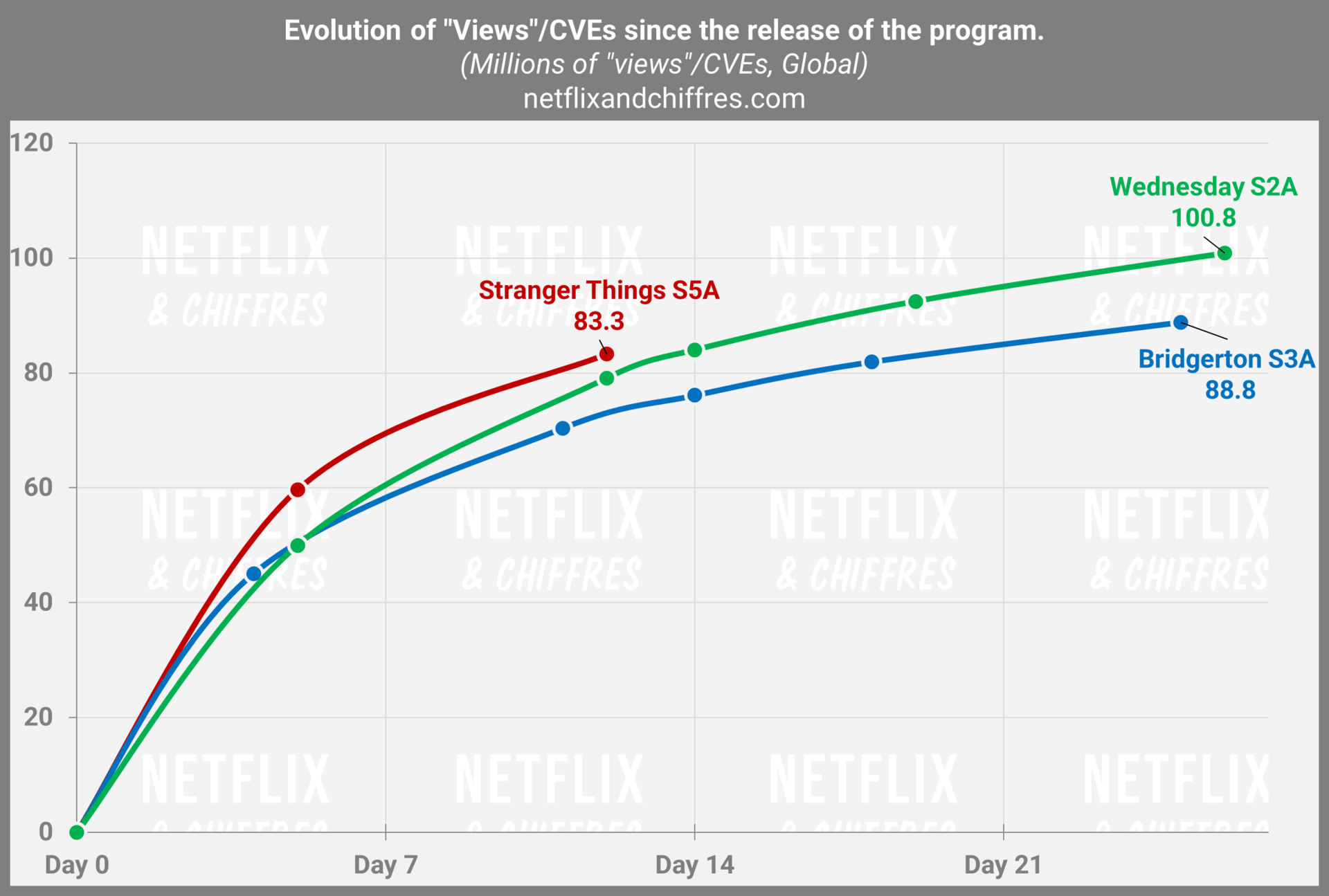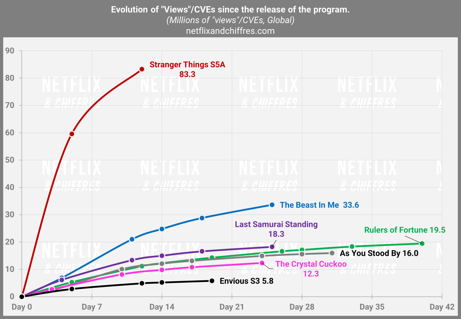Mesure utilisée : Millions d’EVC, soit en Équivalents de Visionnages Complets. Je divise les heures vues (lundi à dimanche dernier dans 192 pays) des Tops 10 Netflix, par la durée des titres pour comparer des programmes de taille différente sortis à des dates différentes. Ce n’est pas une audience en téléspectateurs mais un indicateur arbitraire utilisé aussi depuis juin 2023 par Netflix sous l’appellation “views”. Pour en savoir plus sur ma méthode, lisez cet article.