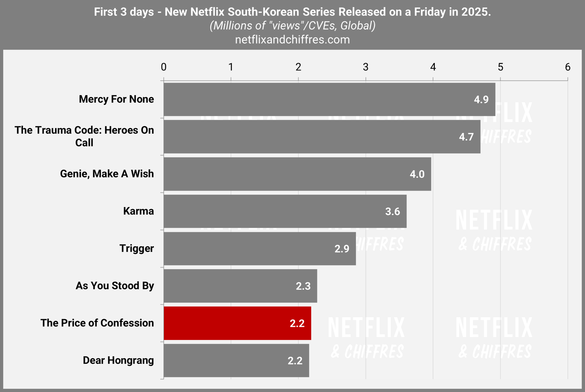 Nouvelle série sud-coréenne et nouvelle déception puisque The Price of Confession fait un lancement très timide avec 2,2M d’EVCs sur ses 3 premiers jours, l’un des moins bons lancements de l’année pour une série sud-coréenne Netflix. L’arbre Squid Game ne va plus cacher la forêt des déceptions très longtemps.