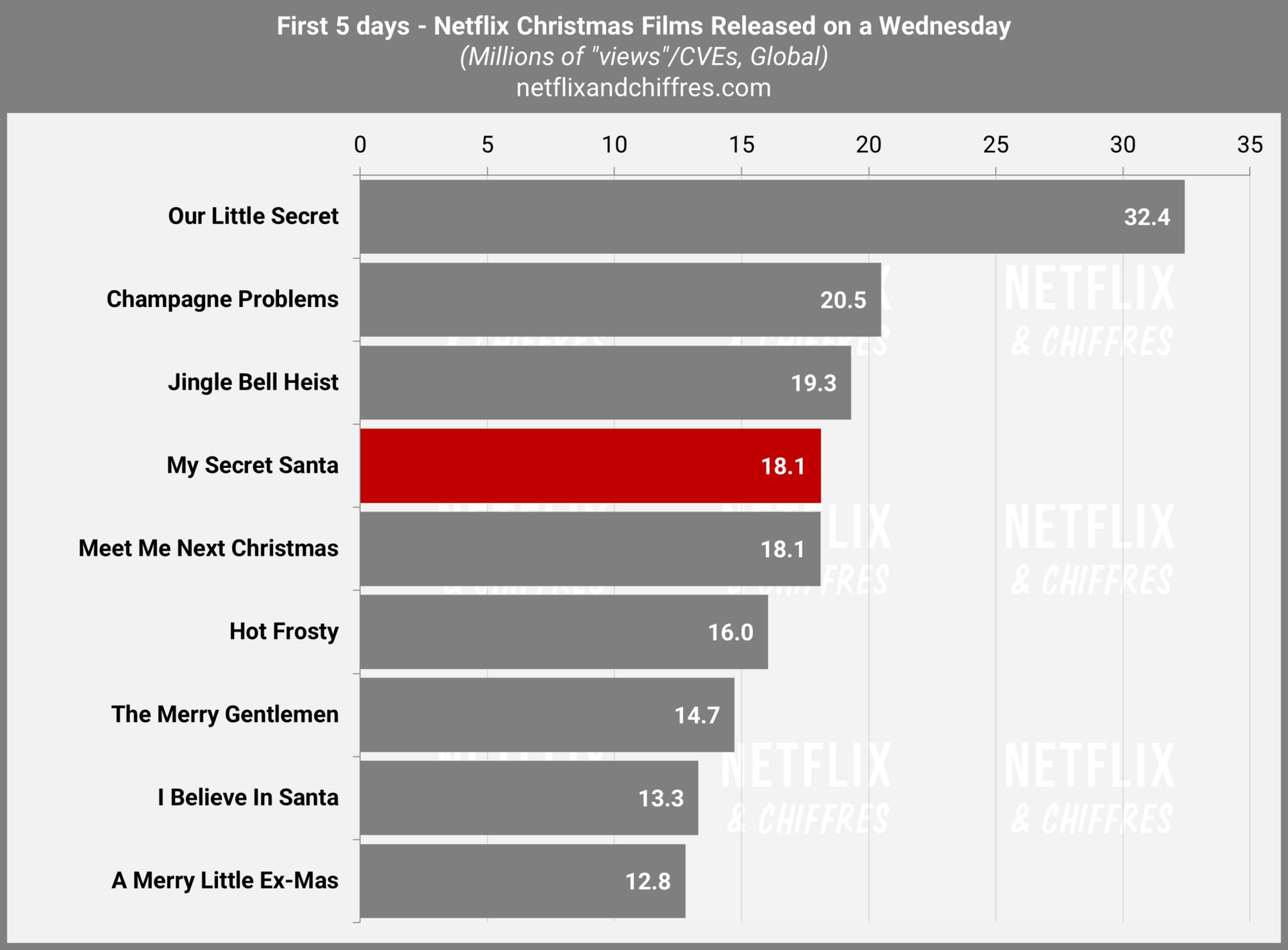 Commençons avec le film de Noël de la semaine, My Secret Santa, qui fait un démarrage vraiment dans la moyenne haute du genre avec 18,1M d’EVCs en 5 jours.