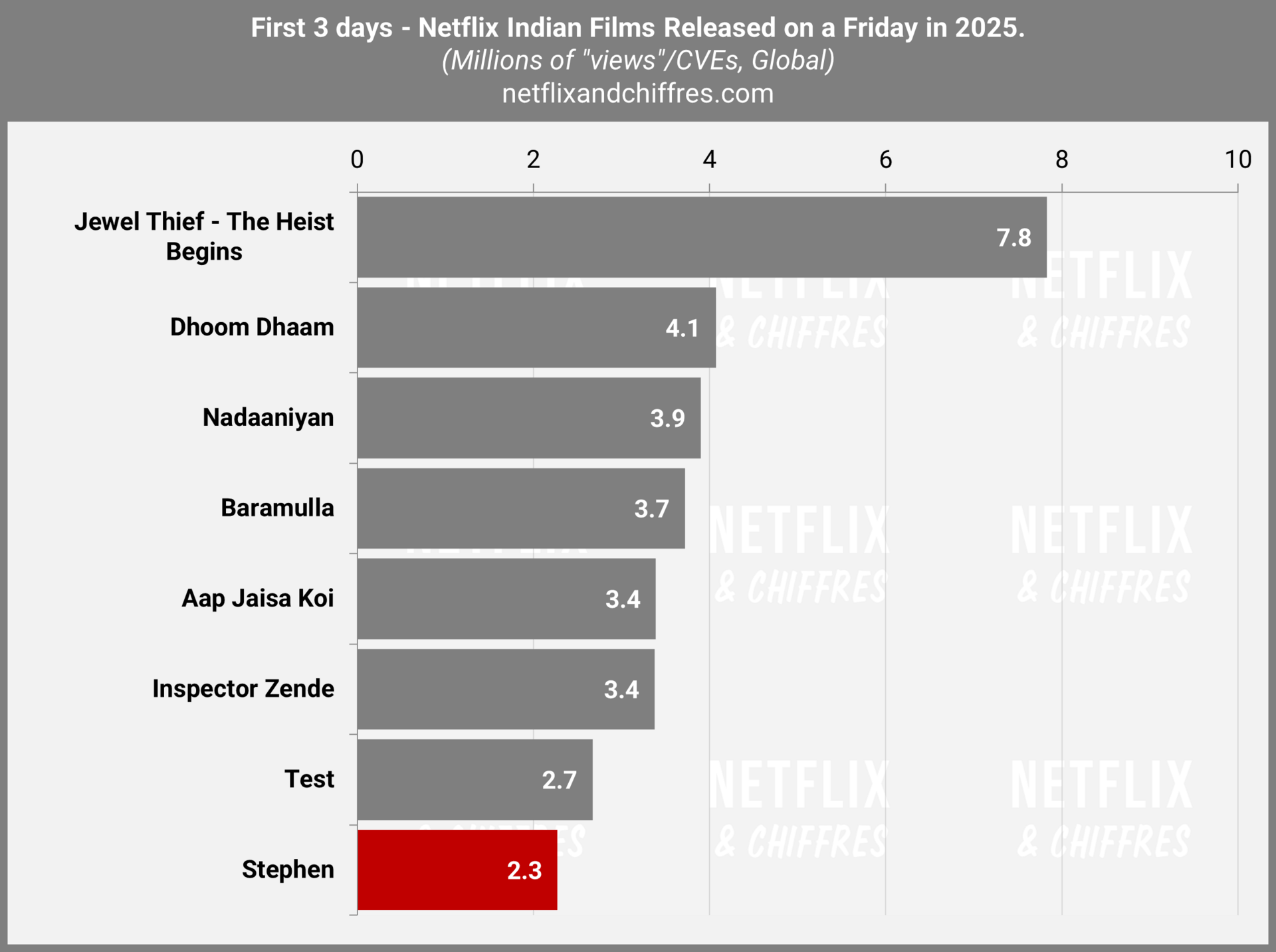 Du côté de l’Inde, c’est aussi un lancement très faible pour Stephen, annoncé tardivement il y a seulement quelques semaines et qui ne totalise que 2.3M d’EVCs sur ses 3 premiers jours, le moins bon lancement d’un film indien Netflix cette année.