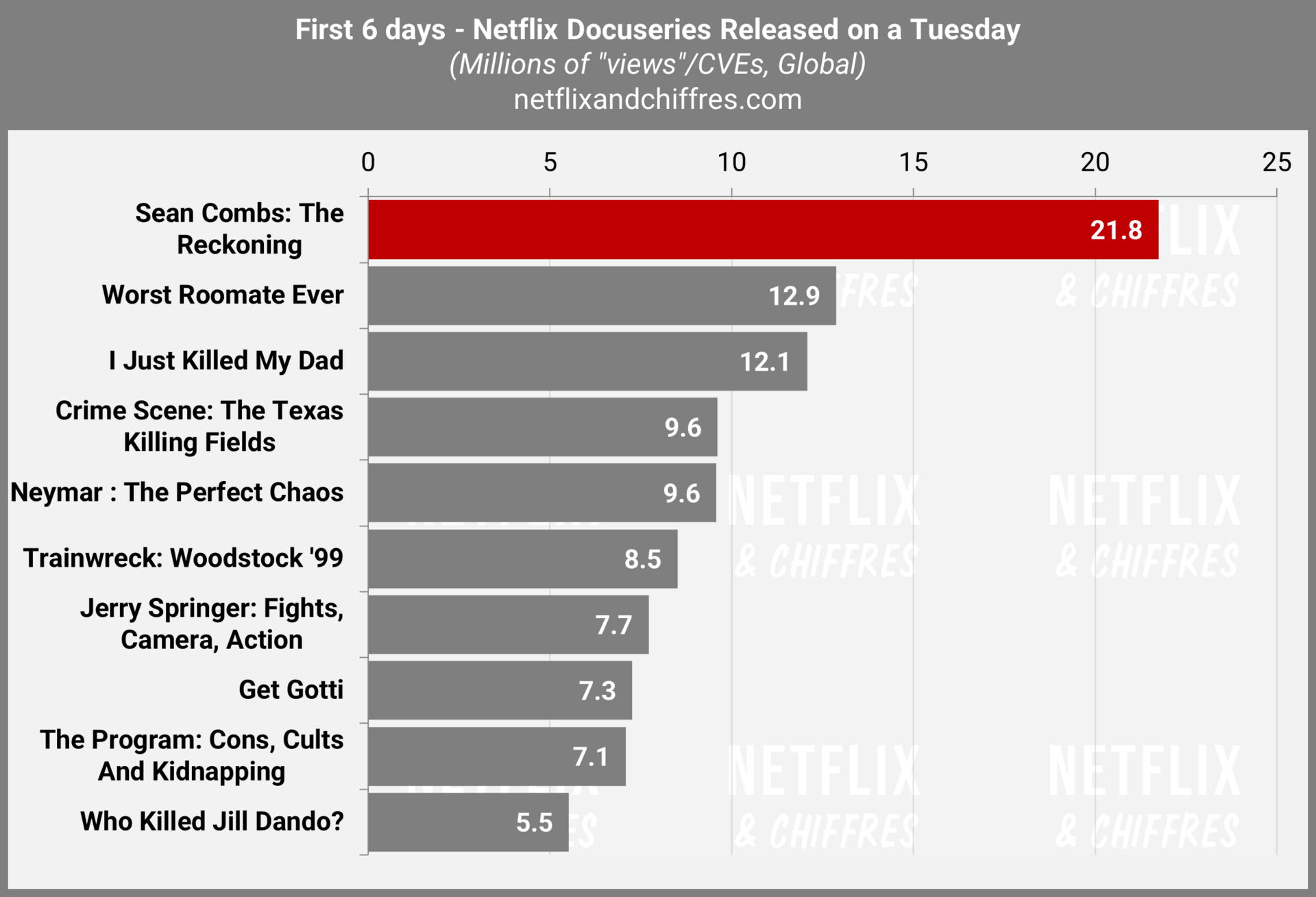 Rien de tel qu’un lavage de linge sale en public pour attirer les regards et la série docu Sean Combs: The Reckoning produite par son ennemi juré 50 Cent a parfaitement rempli son rôle en se lançant avec 21,8M d’EVCs sur ses 6 premiers jours, soit le meilleur lancement d’une série docu sortie un mardi.