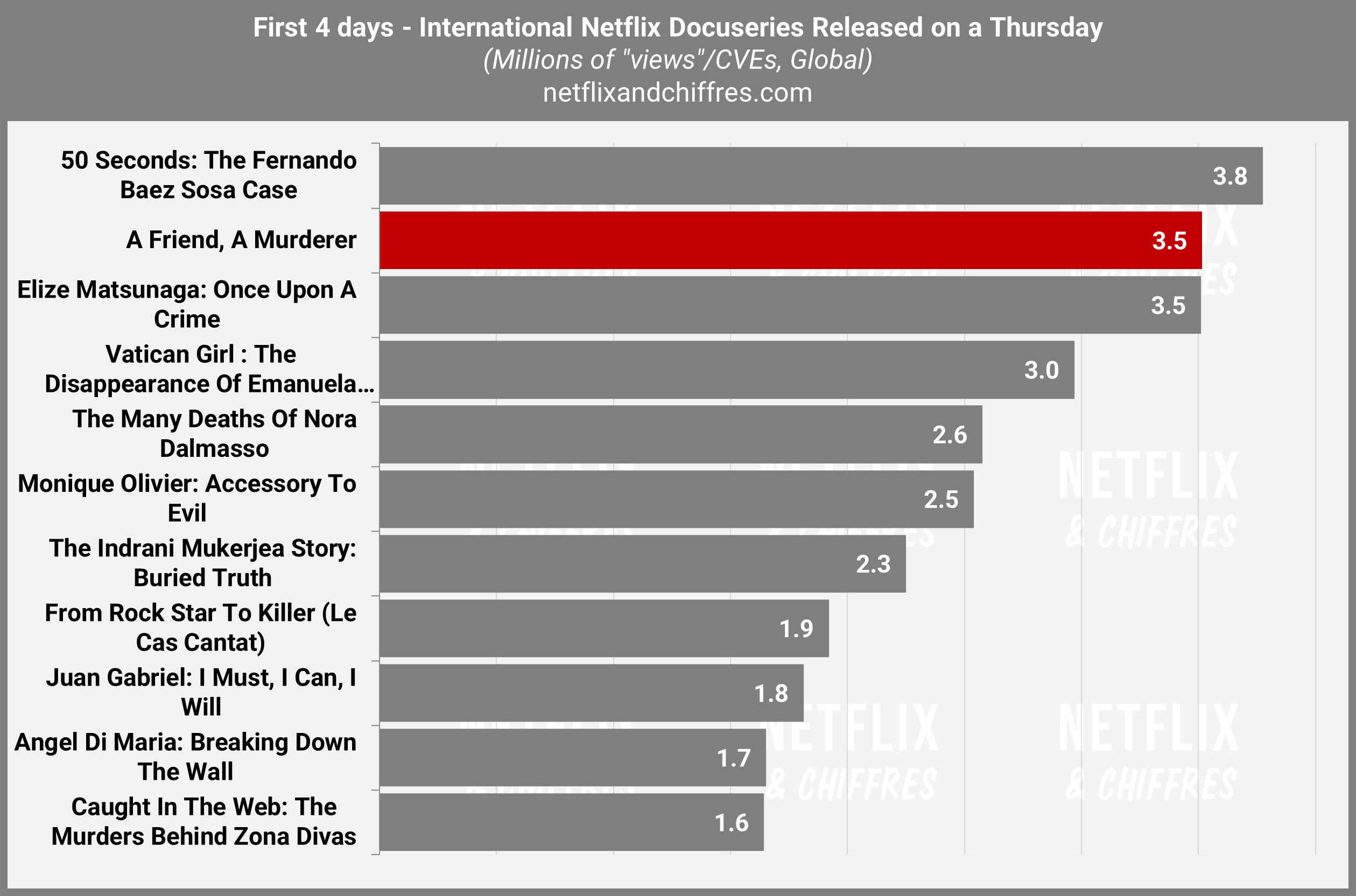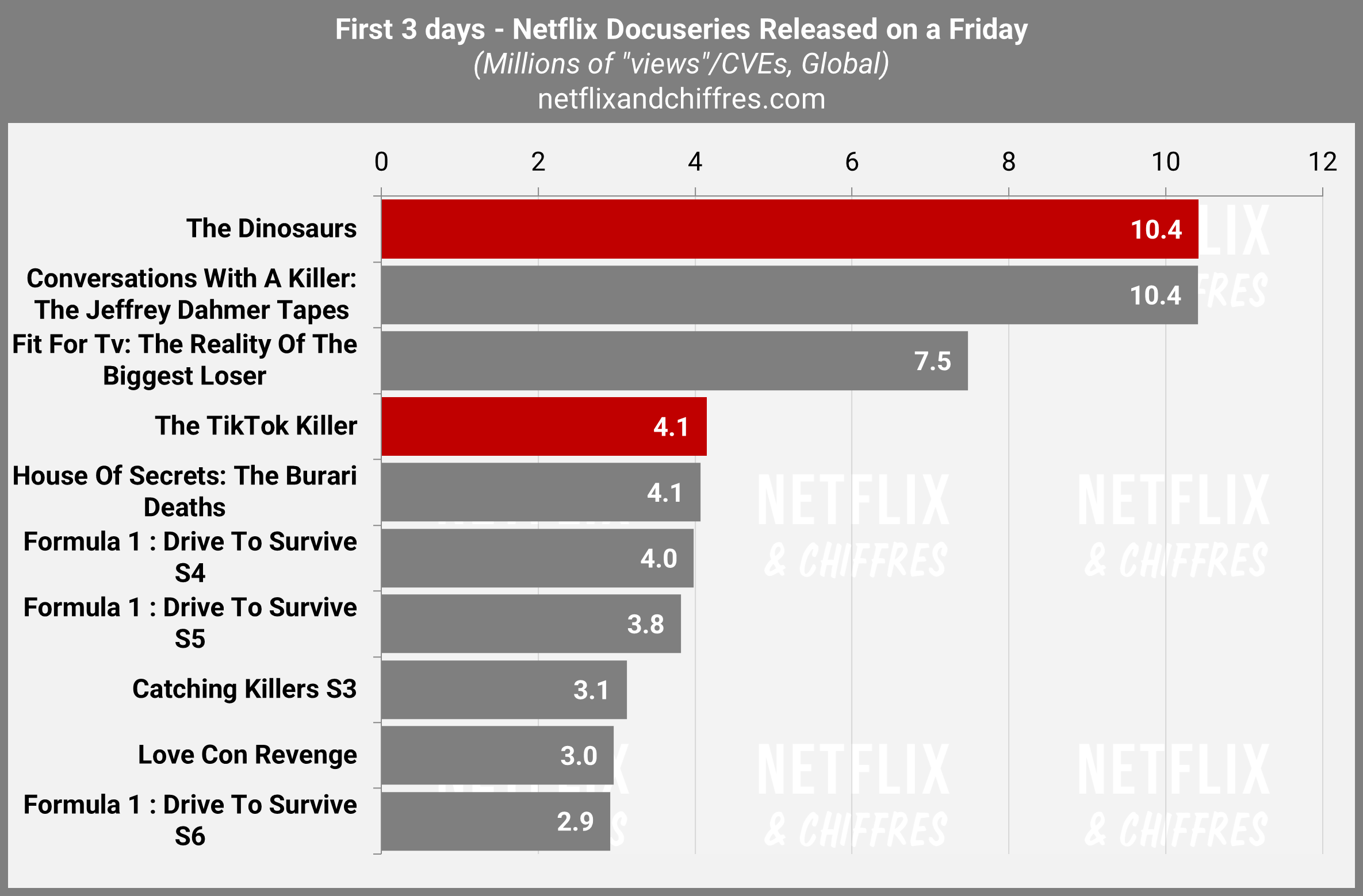 De son côté, la série docu espagnole The TikTok Killer décroche elle le meilleur lancement d’une série docu internationale sortie un vendredi avec 4.1M d’EVCs sur ses 3 premiers jours. Le vendredi, nouveau jour de sortie de prédilection des séries docu chez Netflix ? On verra si la tendance se confirme cette année.