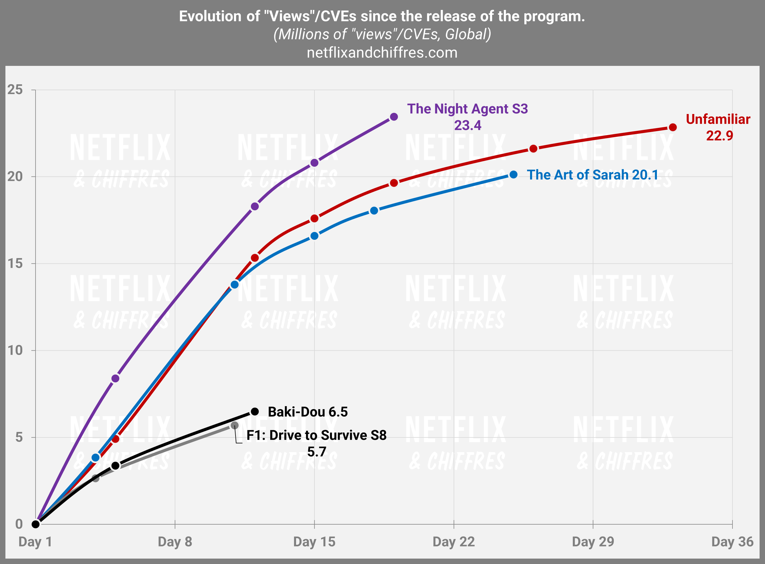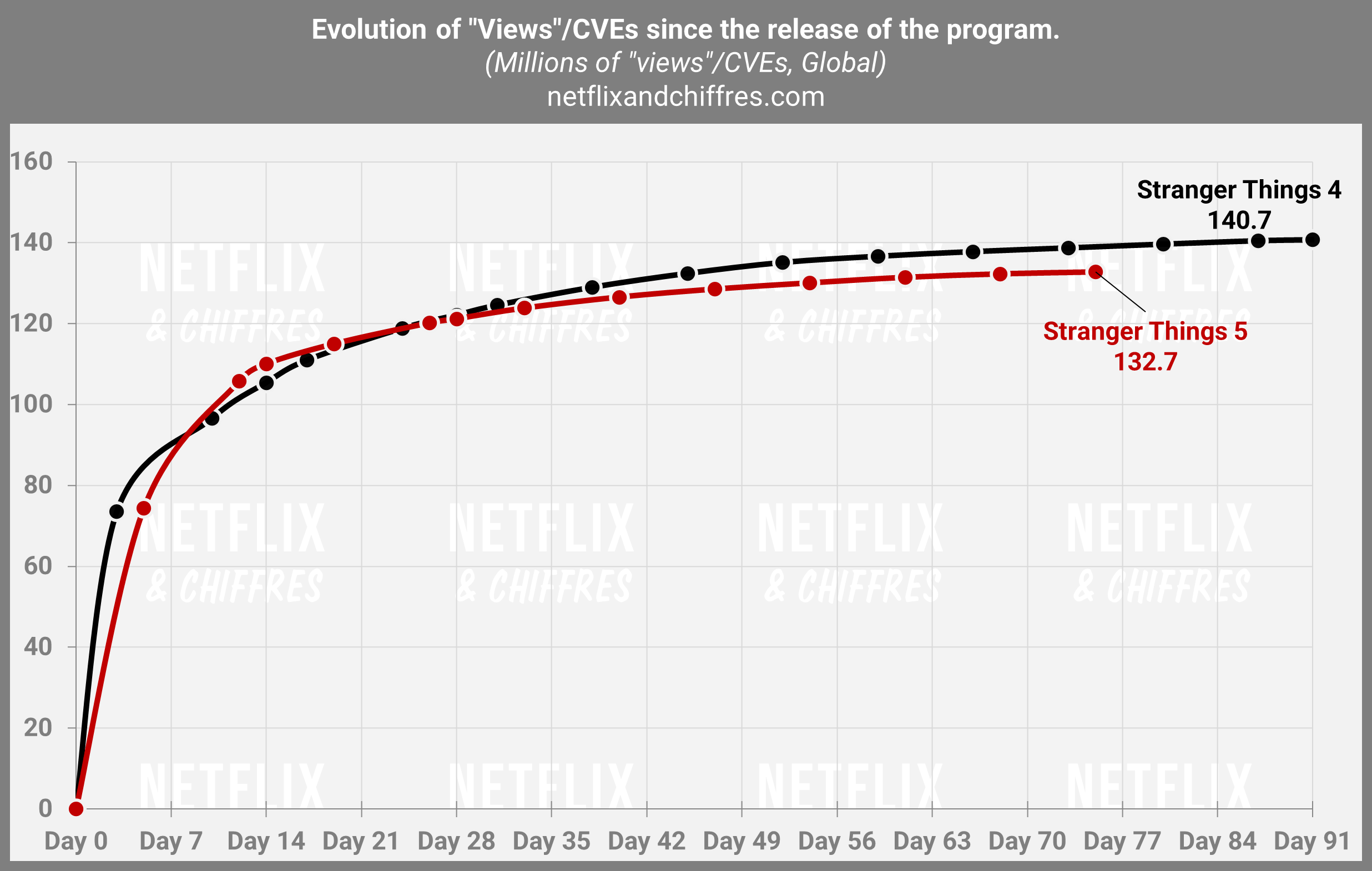 Du côté de la saison 4 de Bridgerton, on commence à y voir un peu plus clair puisque cette saison fait des scores vraiment excellents mais cela devrait être trop juste pour accrocher le Top 10 all-time. La saison affiche déjà 5.2M d’EVCs de retard par rapport à la saison 3, ce qui la place aux alentours des 95M d’EVCs sur ses 91 premiers jours. Trop juste mais vraiment tout à fait excellent.