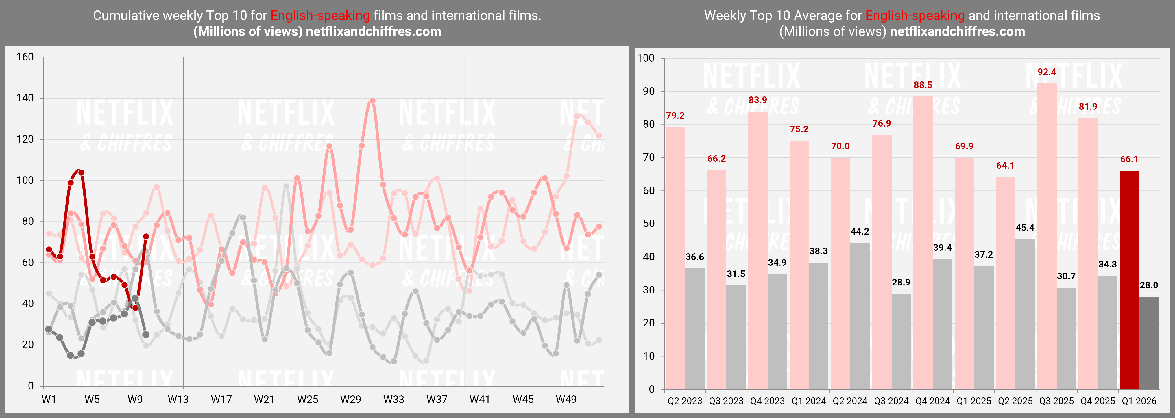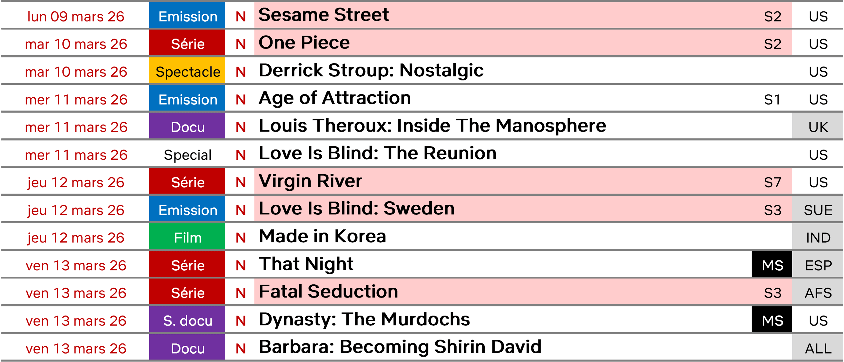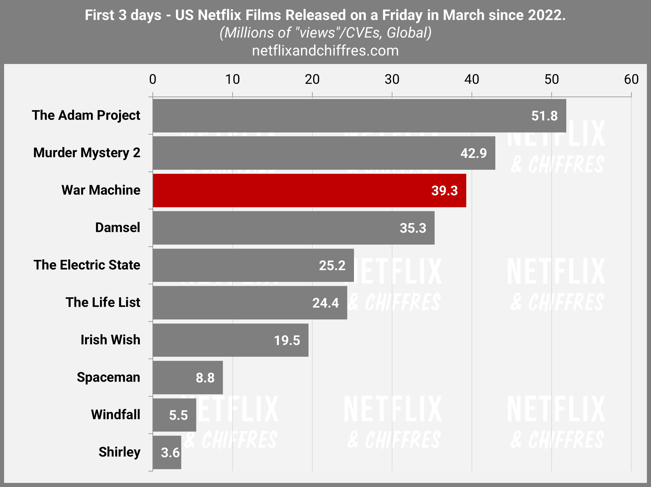 La semaine prochaine, on s’intéressera au lancement de la saison 2 de One Piece qui est l’attraction de cette mi-mars (même si sa sortie un mardi va réduire les comparaisons, au moins au début. Il y aura aussi la saison 7 de Virgin River et d’autres petites choses. Un seul film cependant, pour bien laisser la place à War Machine d’engranger les vues en deuxième semaine.