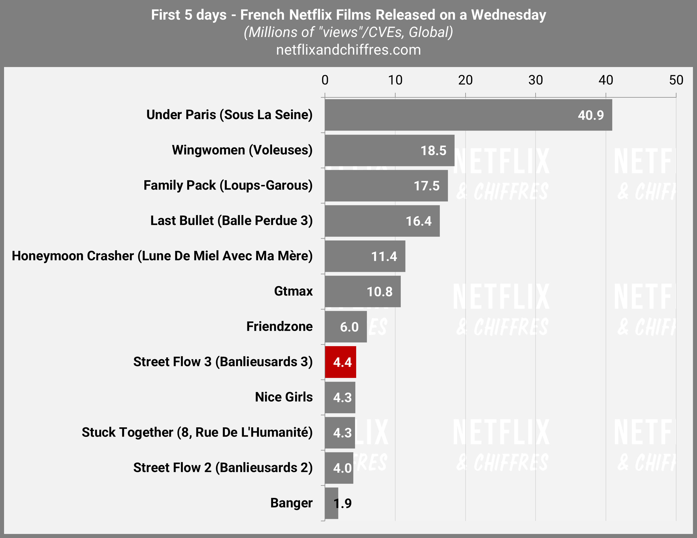 Rares sont les films Netflix français à avoir obtenu deux suites mais Banlieusards est l’un d’entre eux (avec Balle perdue). Le troisième et dernier volet est sorti la semaine dernière et commençons par la bonne nouvelle : le film de Kery James fait un meilleur démarrage que le film précédent avec 4.4M d’EVCs sur ses 5 premiers jours, contre 4M pour le précédent sur la même période.