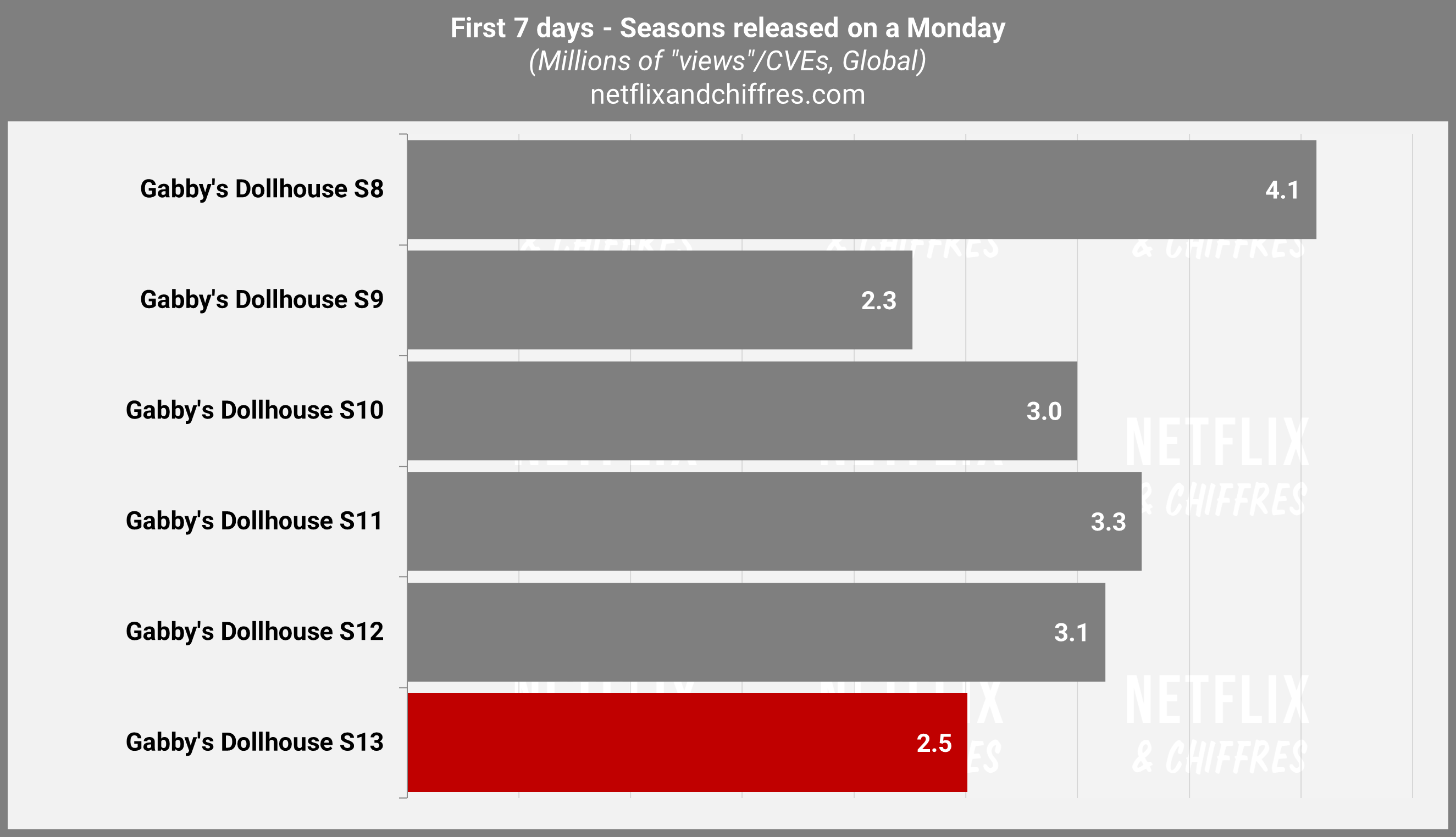 C’est un petit coup de mou pour Gabby et sa maison magique ! Et c’est un peu normal après 13 saisons, non ? Cette saison enregistre 2.5M d’EVCs sur ses 7 premiers jours soit un net déclin depuis deux saisons mais c’est toujours mieux que le lancement de la saison 9 donc la série peut sans doute rebondir si une saison 14 sort.