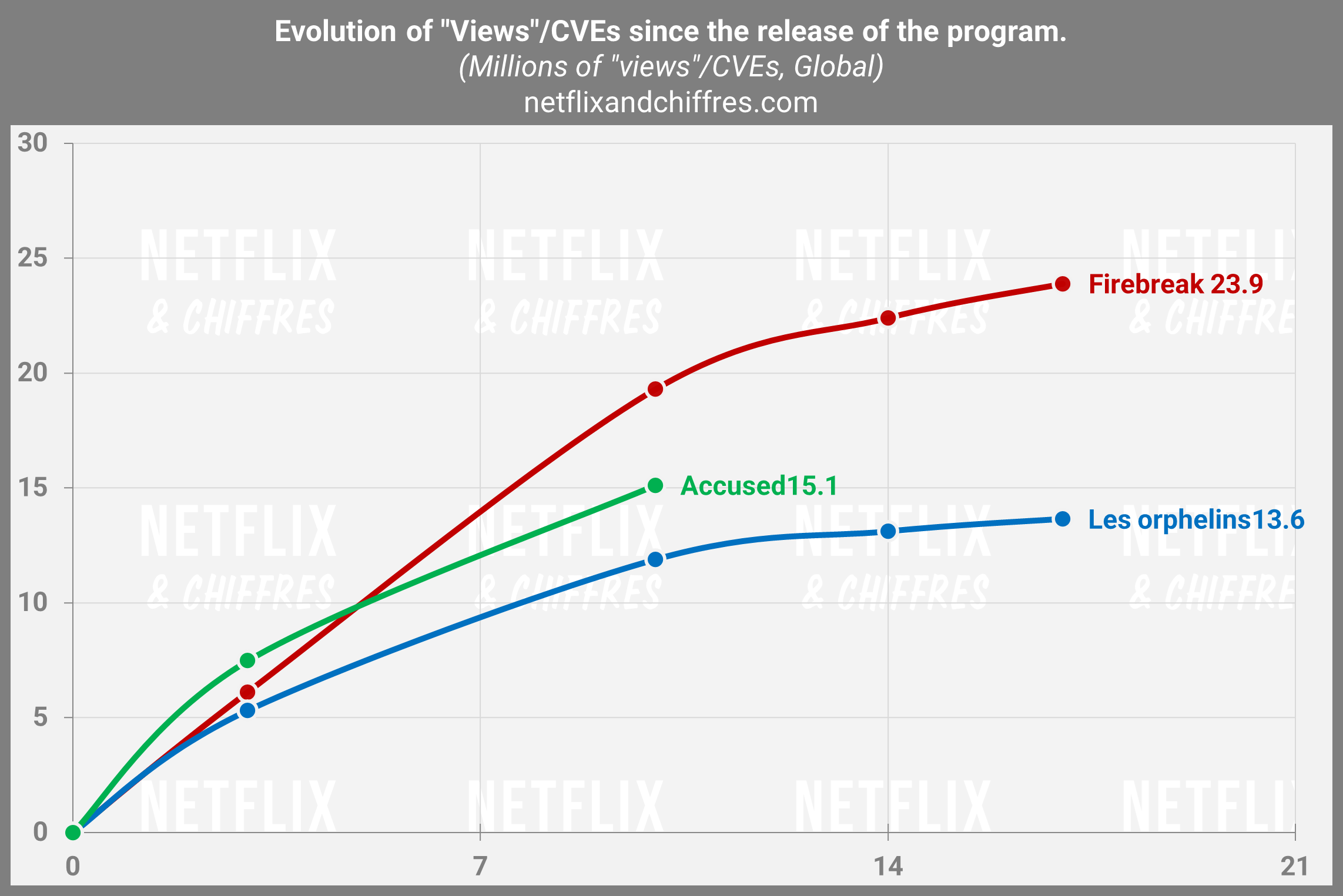 Mesure utilisée : Millions d’EVC, soit en Équivalents de Visionnages Complets. Je divise les heures vues (lundi à dimanche dernier dans 192 pays) des Tops 10 Netflix, par la durée des titres pour comparer des programmes de taille différente sortis à des dates différentes. Ce n’est pas une audience en téléspectateurs mais un indicateur arbitraire utilisé aussi depuis juin 2023 par Netflix sous l’appellation “views”. Pour en savoir plus sur ma méthode, lisez cet article.