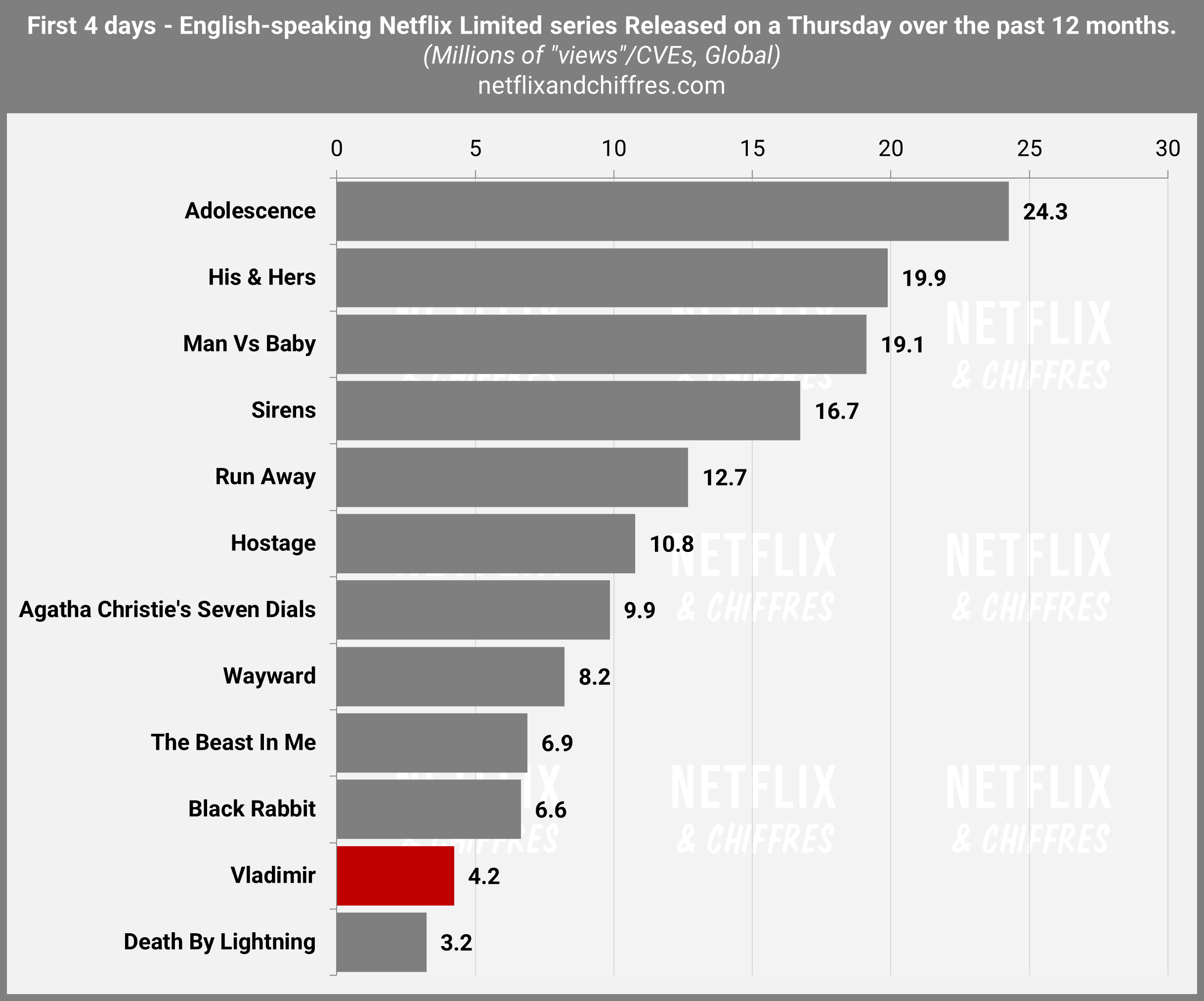 La mini-série prestige Vladimir avec Rachel Weisz ne fait pas recette mais c’était prévisible avec ce titre peu vendeur par les temps qui courent. La série se lance avec 4.2M d’EVCs en 4 jours, soit le second pire lancement d’une mini-série anglophone sortie un jeudi ces 12 derniers mois.