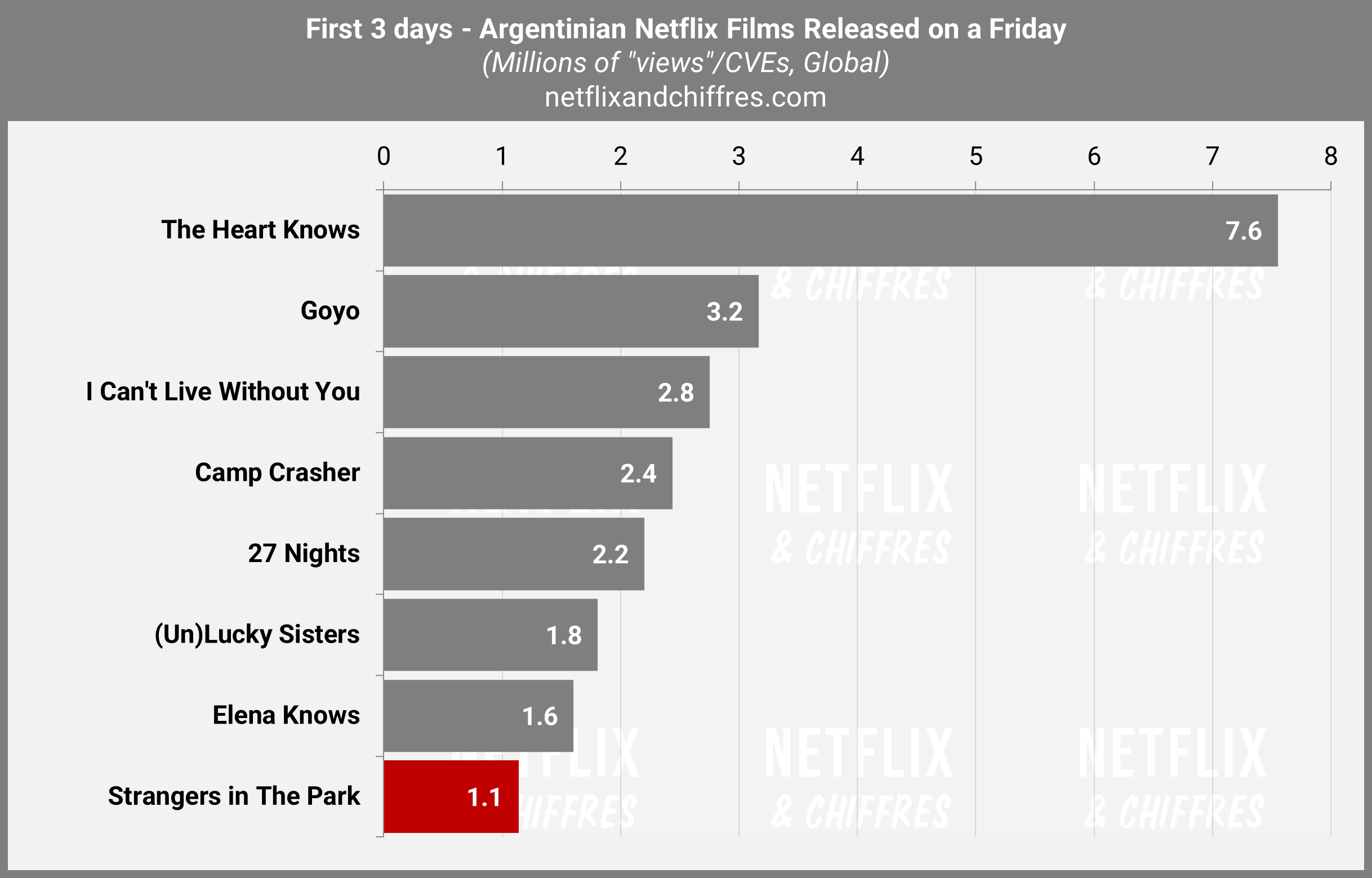 Du côté de l’Argentine, c’est moins probant pour le film Strangers in the Park qui réalise le moins bon lancement d’un film argentin Netflix sorti un vendredi, avec seulement 1.1M d’EVCs sur ses 3 premiers jours. Bon, cela fait quand même l’équivalent de 250 visionnages par minute.