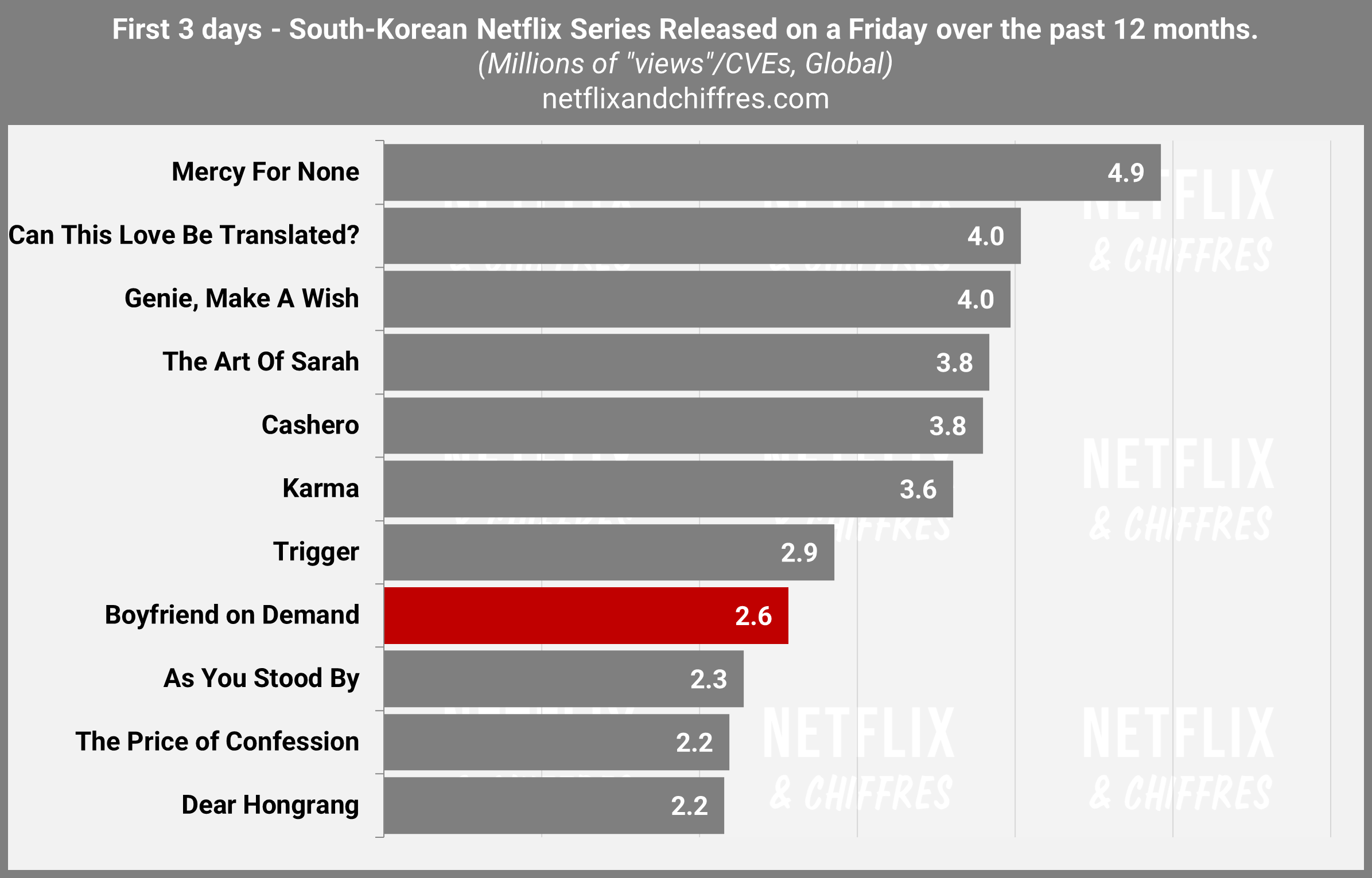 La dernière série sud-corénne Netflix semble faire le buzz sur les réseaux sociaux avec la présence d’une star de la KPop à son casting mais cela ne se traduit pas dans les chiffres de lancement avec seulement 2.6M d’EVCs en 3 jours. C’est dans la moyenne basse des lancements de séries sud-coréennes des 12 derniers mois.