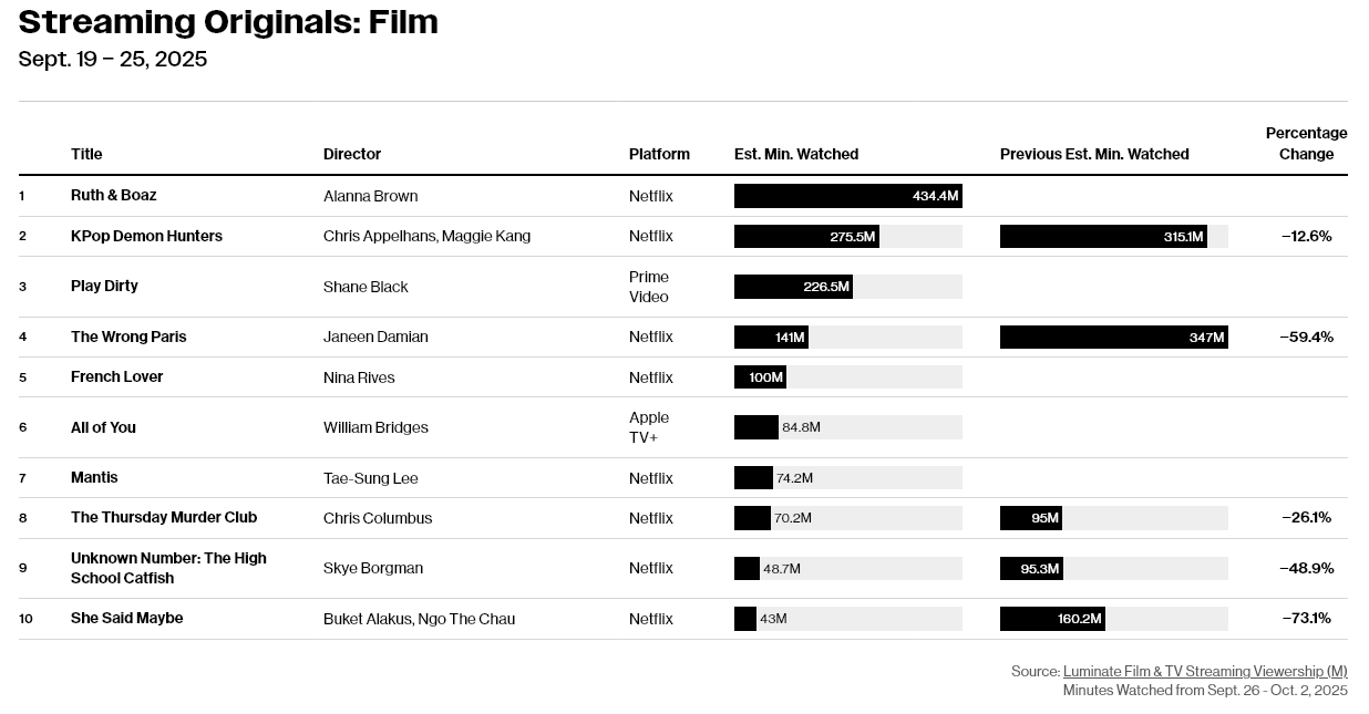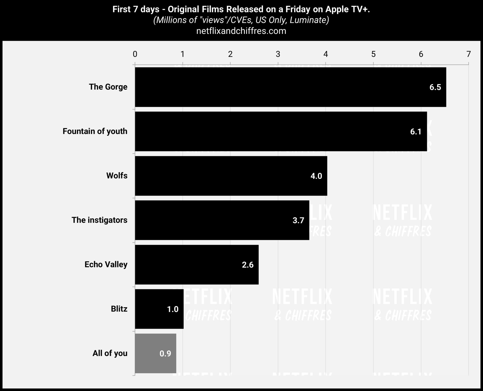 Que c’est dur pour le film romantique All of you d’exister sur Apple TV+… L’aura de Ted Lasso n’aura pas aidé le film avec Brett Goldstein et Imogen Poots à atteindre les sommets déjà pas très hauts d’Apple TV+. Avec seulement 0,9M d’EVCs sur ses 7 premiers jours, c’est même les profondeurs que le film explore, faisant moins que Blitz. Mais il a au moins réussi à accrocher une place dans le Top 10 de Luminate donc c’est déjà une toute petite victoire.