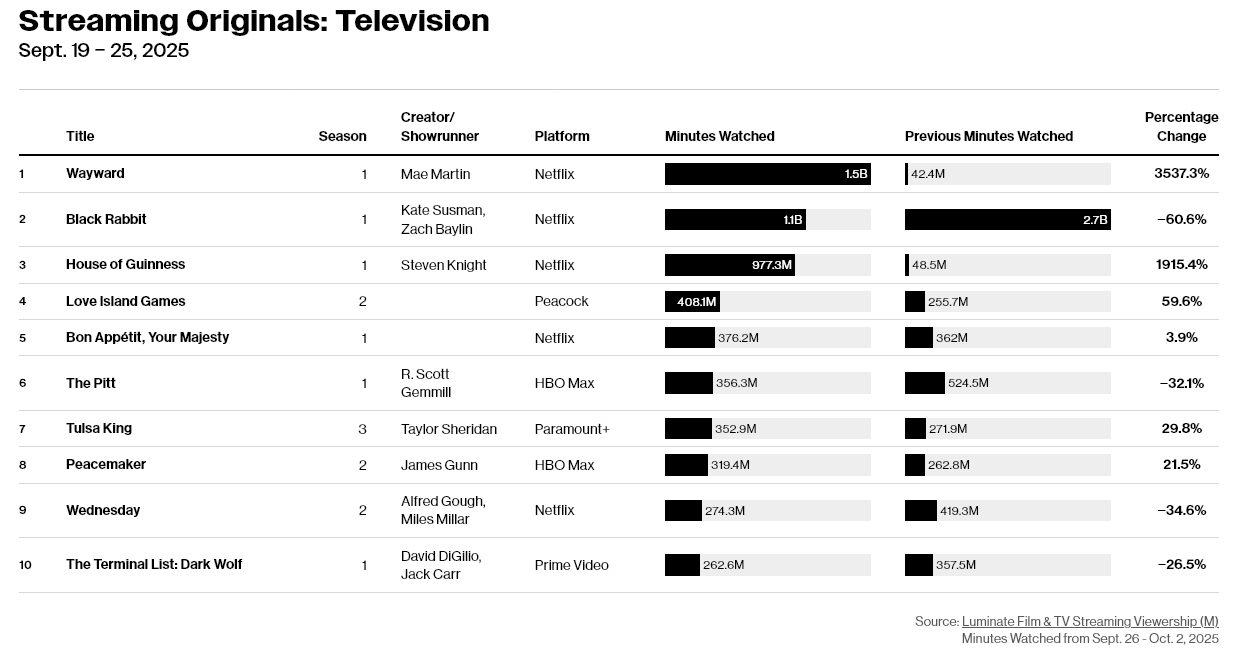 Une autre série de retour en ce mois d’octobre est Tulsa King, avec Sylvester Stallone qui fait un lancement en baisse pour ses deux premières semaines et deux premiers lots d’épisodes sur Paramount+ selon Luminate.