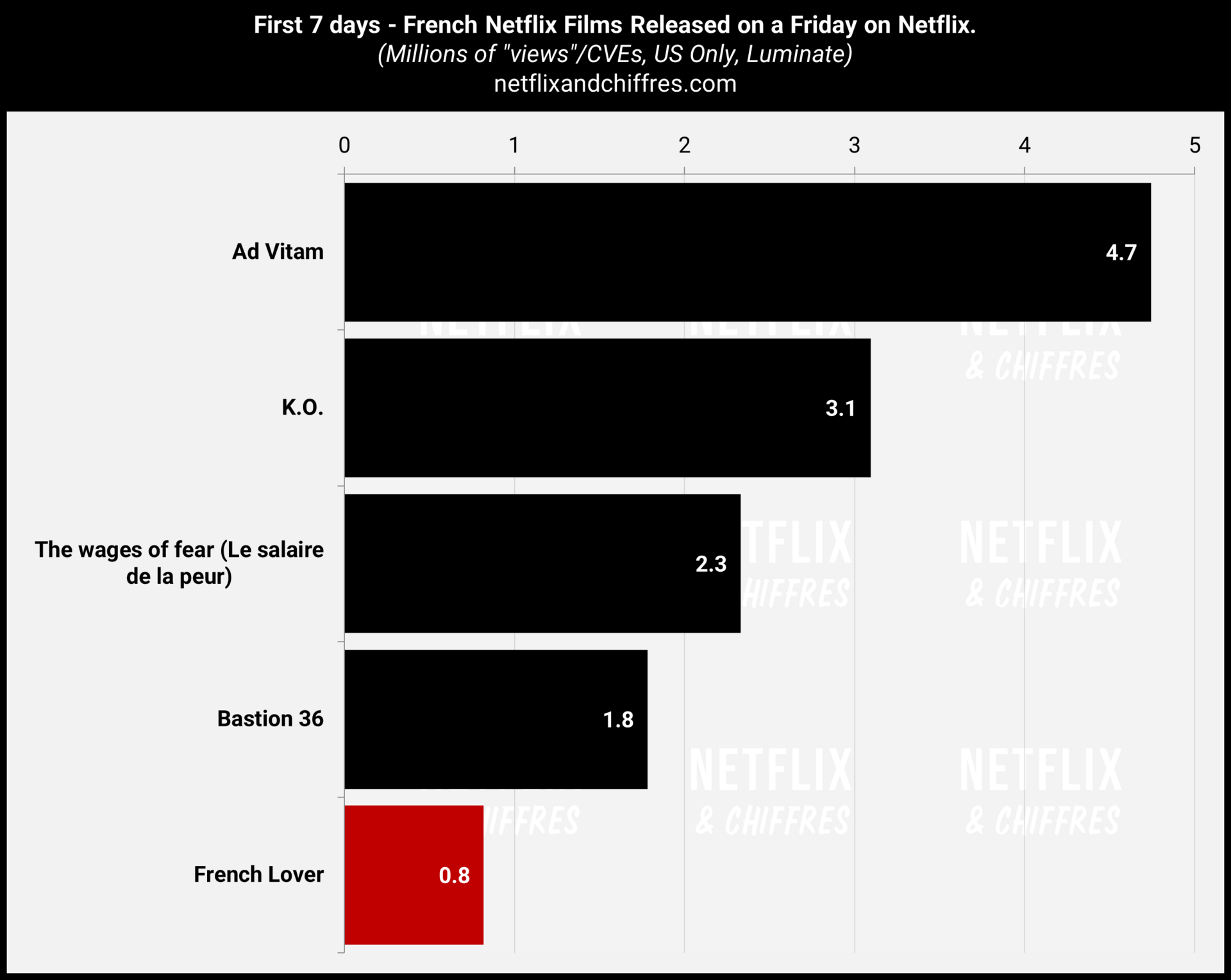 Le film français French Lover a fait moins bien que All of You sur Netflix sur ses 7 premiers jours avec seulement 0,8M d’EVCs et c’est de loin le moins bon lancement d’un film français parmi ceux ayant réussi à se placer dans le Top 10 Luminate