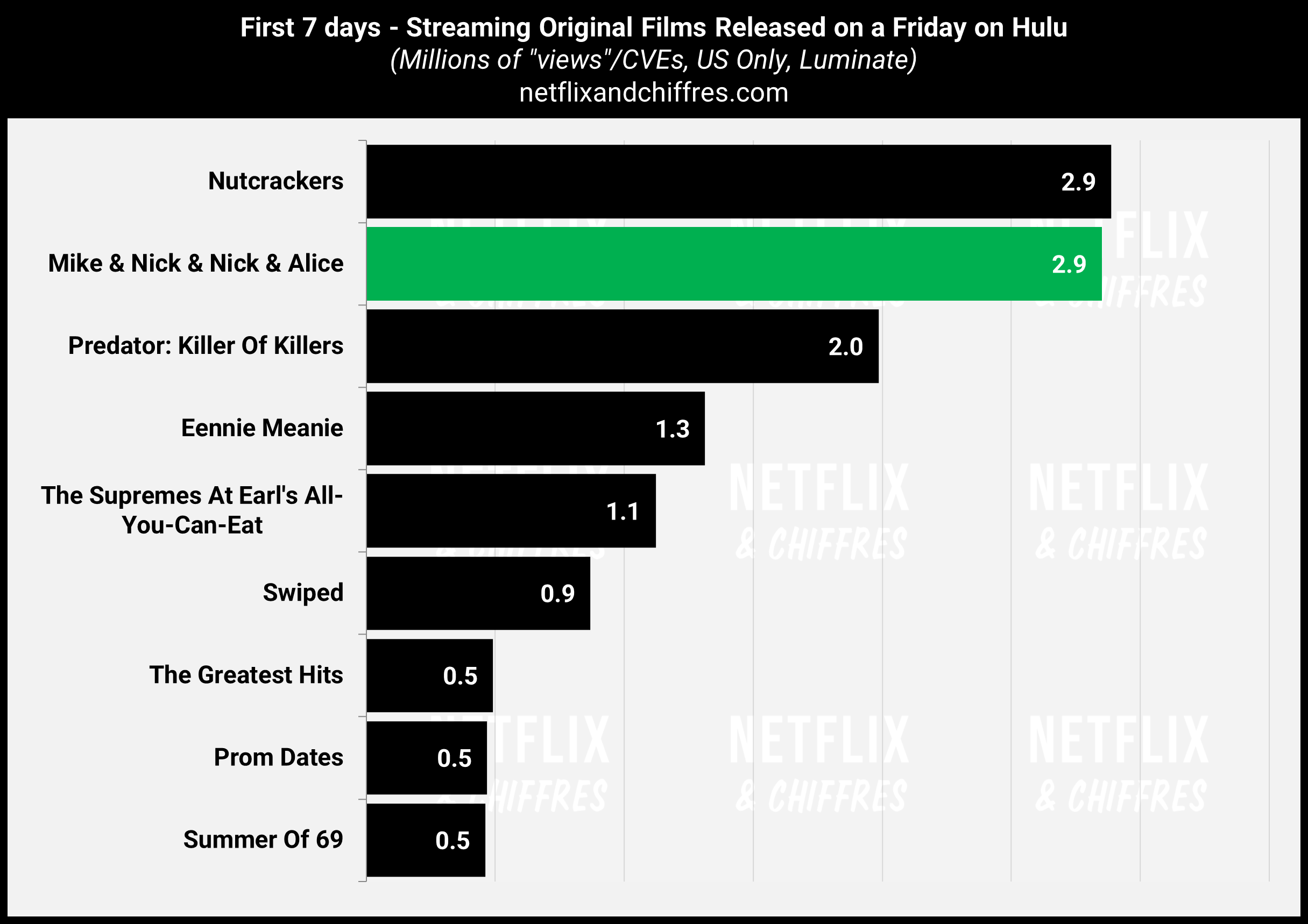 Sur Hulu, le film Mike & Nick & Nick & Alice a eu de bonnes critiques et son lancement est très bon, pour un film sorti sur Hulu avec 2.9M d’EVCs sur sa première semaine. C’est cependant très & très & très & très & très & très & très & très loin des meilleures premières semaines de films sortis un vendredi, tous streamers confondus.