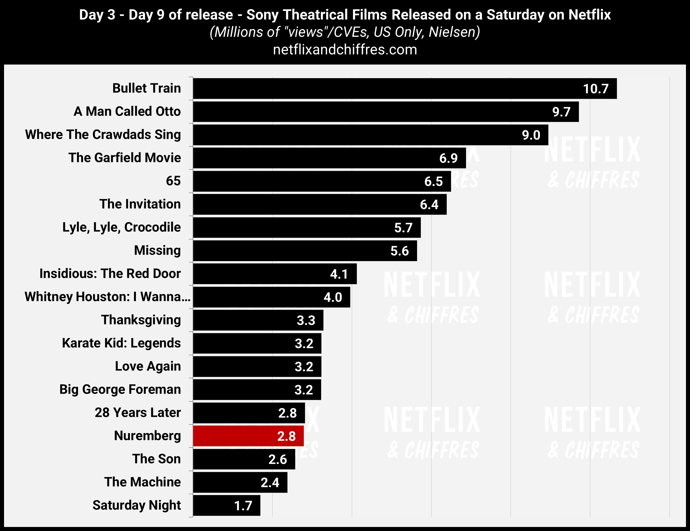 Nuremberg avait manqué le Top 10 Nielsen pour ses deux premiers jours (le film a été mis à dispo sur Netflix un samedi), mais il est parvenu à l’intégrer pour sa première semaine complète. Avec 2.8M d’EVCs entre son 3ème jour et son 9ème jour de disponibilité, le film Sony Classics fait un lancement relativement faible, sensiblement au-dessus de celui de The Son, autre film Sony Classics et à égalité avec celui de 28 Years Later.