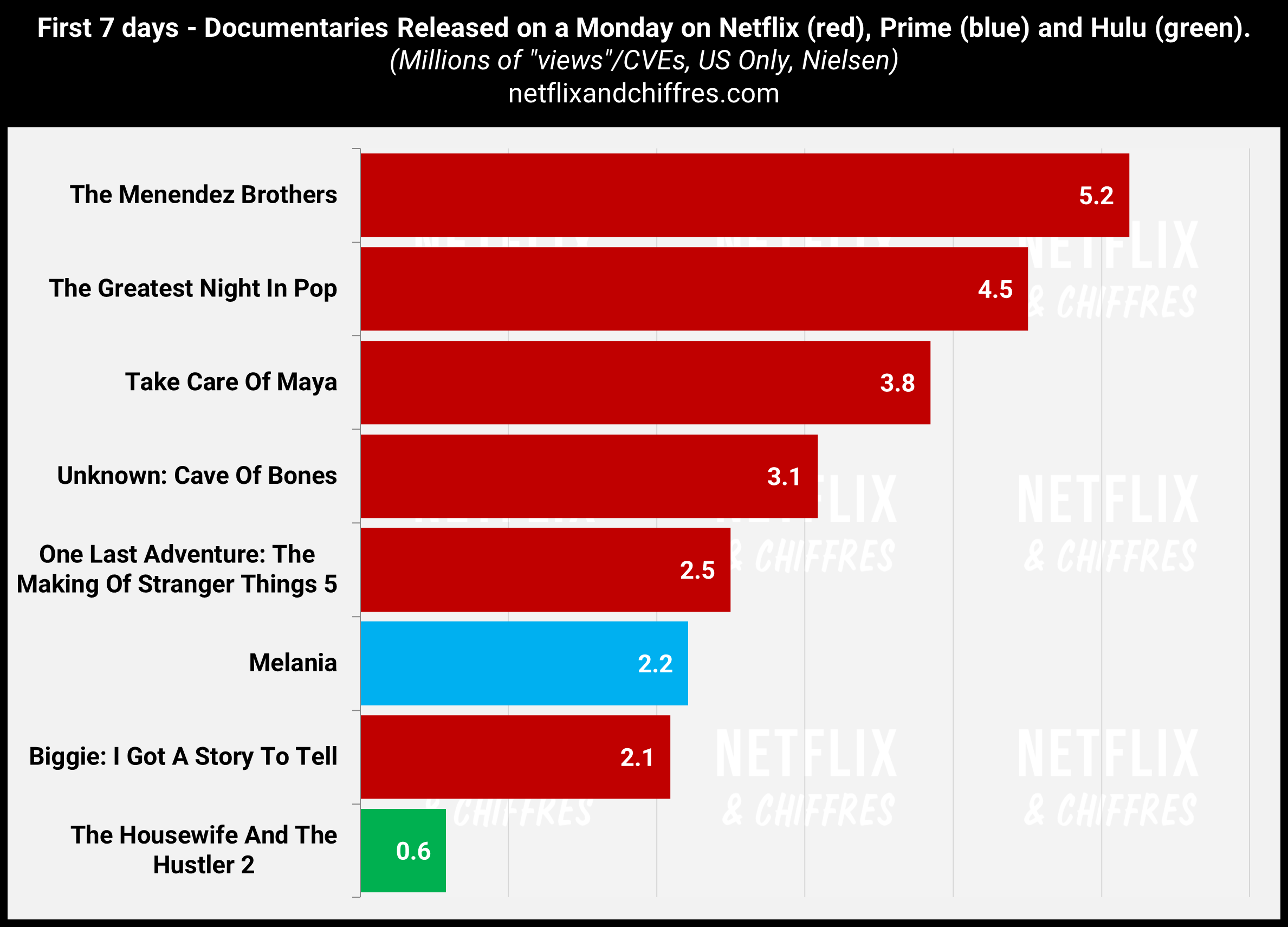Revenons sur Prime pour le lancement de Melania, le docu à 75 millions de dollars qui n’est pas du tout de la corruption-non-non-non de Jeff Bezos envers la famille Trump. Selon Nielsen, c’est le “meilleur lancement d’un docu sur Prime” mais là aussi, ils comparent un docu sorti un lundi et qui a donc eu 7 jours pour engranger des vues à d’autres qui sont sortis à d’autres moments de la semaine donc forcément, c’est pas tout à fait équitable. Si on veut être équitable et comparer Melania à d’autres docus sortis un lundi, on voit que cette performance n’en est pas tout à fait une non plus.