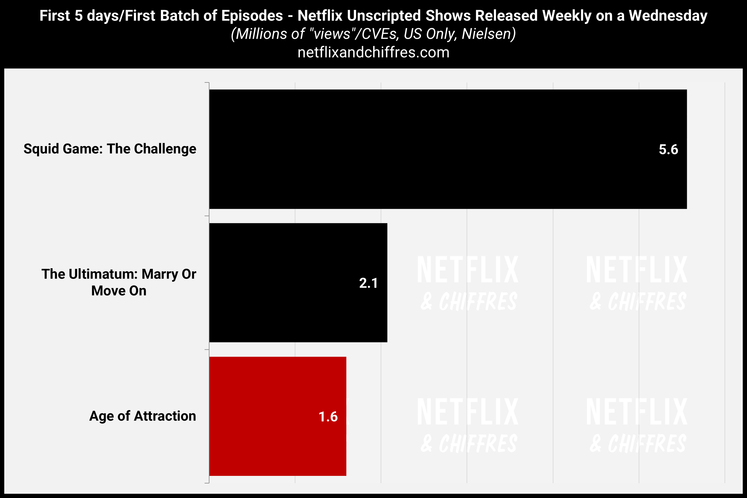 Terminons ce très long panorama des audiences de Nielsen cette semaine avec le lancement de l’émission hebdomadaire Age of Attraction dans laquelle des inconnus se draguent mais sans avoir le droit de se dire leur âge. Pour son premier lot d’épisodes, l’émission fait un lancement mitigé, avec 1.6M d’EVCs en 5 jours, soit à quelques encablures de The Ultimatum notamment. Mais l’émission a déjà été renouvelée donc Netflix doit en être content.