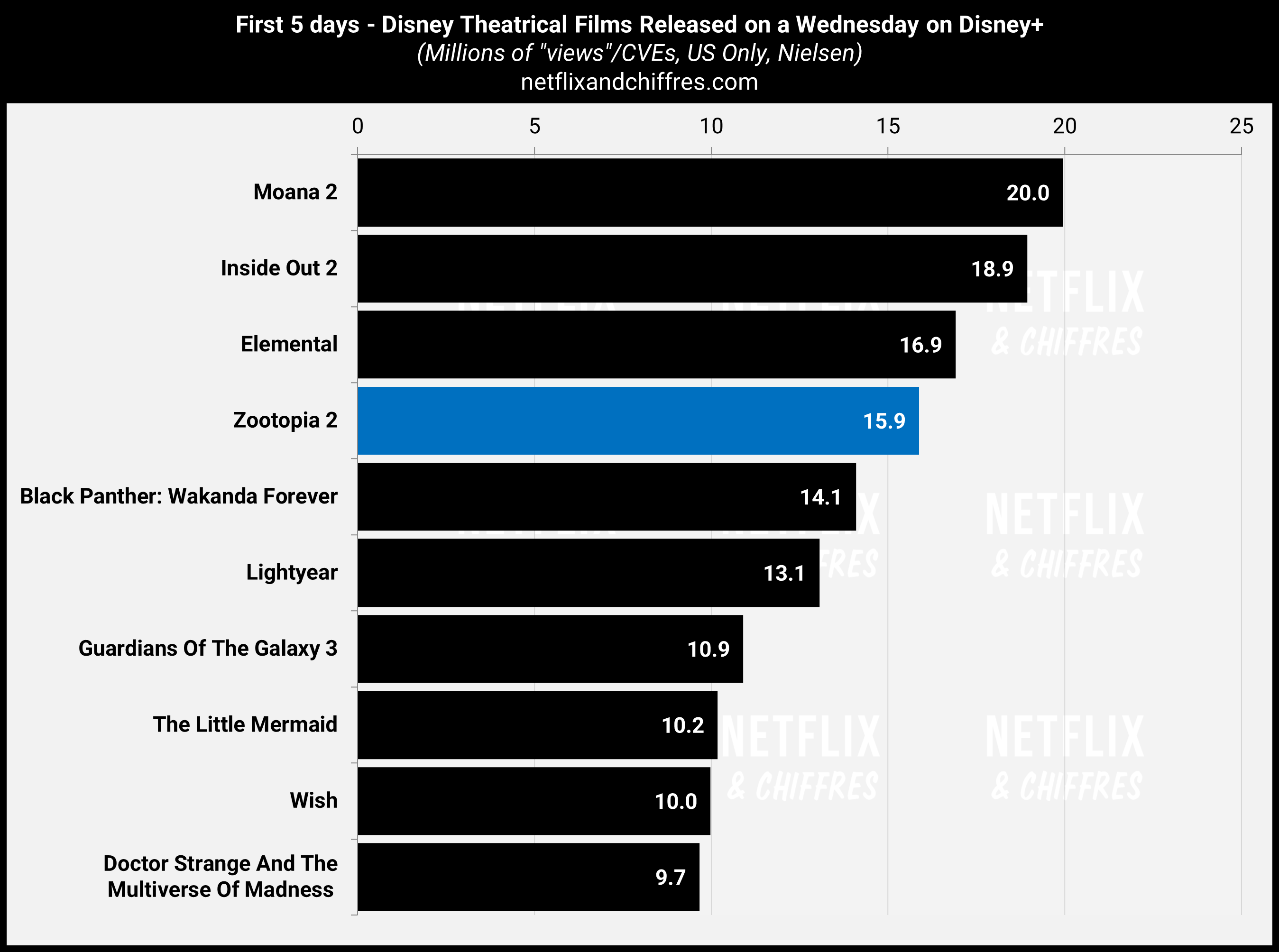 Après son exceptionnelle carrière dans les salles de cinéma US, le film d’animation Zootopia 2 a débarqué sur Disney+ à la mi-mars et il fait un démarrage excellent avec 15.9M d’EVCs sur ses 5 premiers jours. Un très bon total mais en-dessous des lancements de Moana 2, Inside Out 2 et Elemental. Je me demandais pourquoi Disney ne s’était pas fendu d’un petit communiqué de presse vantant les audiences du film sur le service mais je comprends mieux pourquoi. C’est un excellent lancement mais pas un lancement record.