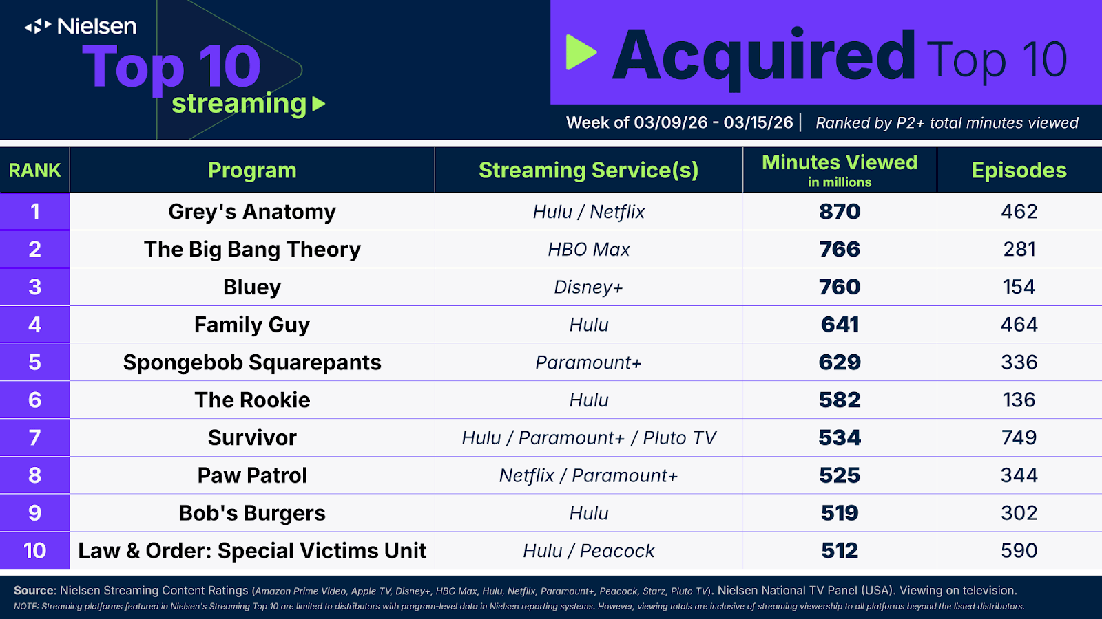 Les chiffres de cet article viennent du Top 10 Nielsen et du Top 10 Luminate.